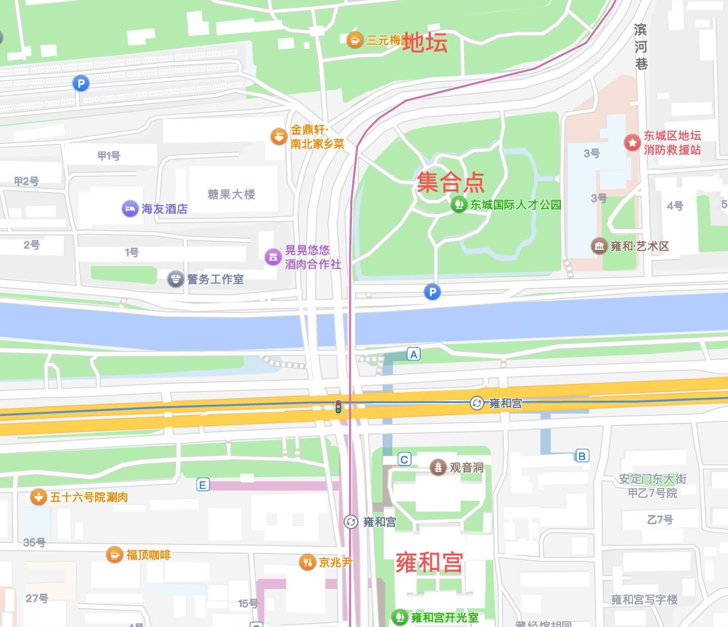 集合点位于地铁雍和宫站A口北侧河对岸小公园(东城国际人才公园),参看下图: