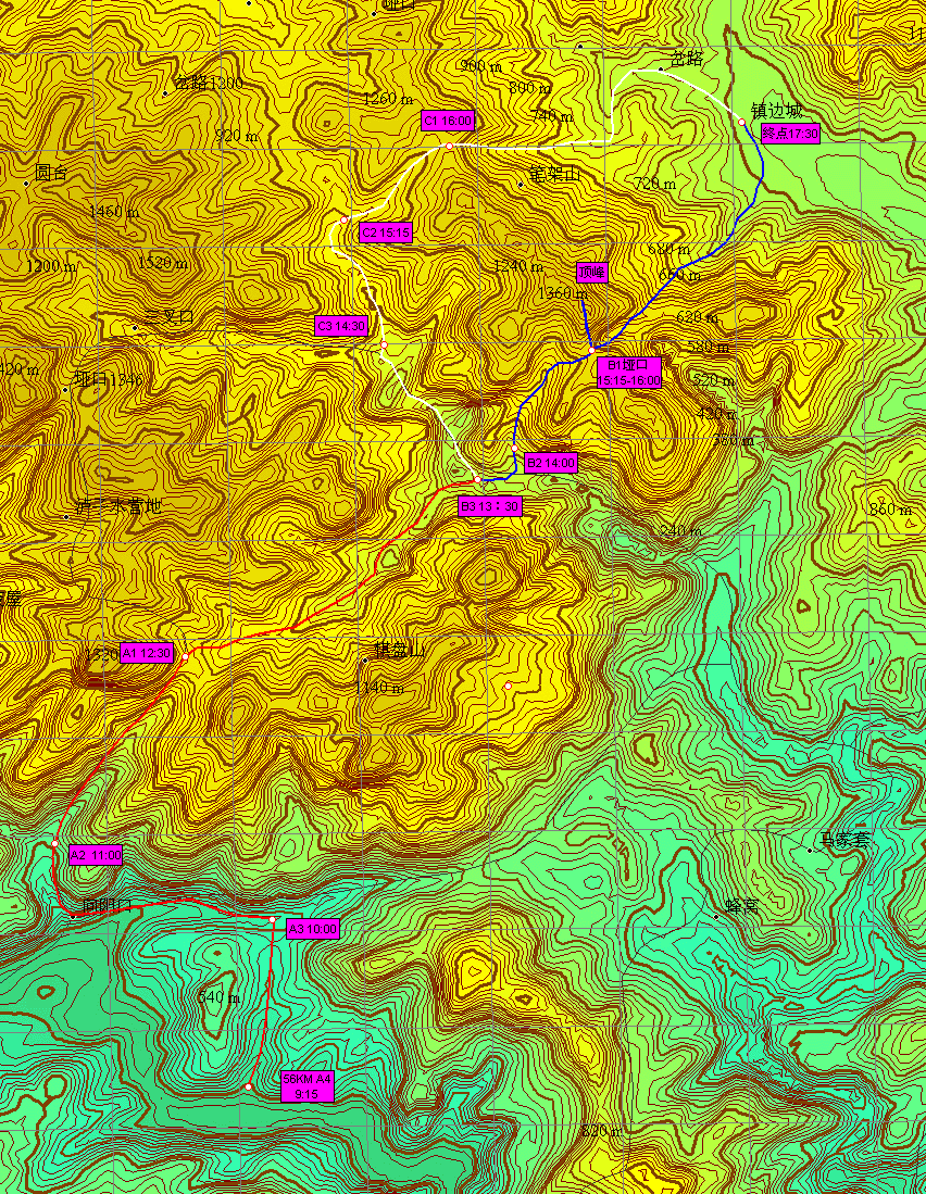 本次活动分A(红)、B(蓝)、C(白)三条路线。A线必走。到达B3点后先尝试B路线,若能找到B2点且路线可行,则沿B路线登顶笔架山后至镇边城;若B路线不通则走C路线。
