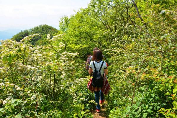 10:30开始徒步上山,穿行在进香古道,越过山地、溪流、峡谷、岗地、丘陵,行走在春天的山野间,远处村落渺渺的人家,蓝天白云、青山起伏,树木迭翠,一片田园风光,令人心旷神怡。