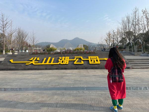 (如图:尖山湖公园大门口,这里集合)
