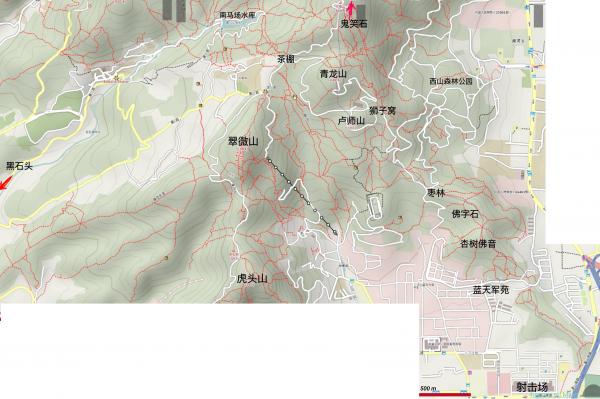 香山小学(香山小学防火门被关闭已无法上山)北京射击场上山,经狮子窝、青龙山、茶棚下南马场水库。在水库边休息,野餐,玩耍。饭后一路下山到黑石头,公交597回城