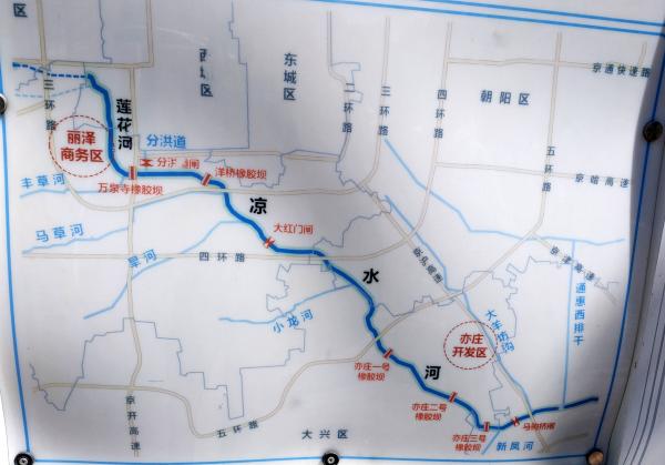 凉水河开凿于隋代,距今已有1400多年历史,曾发挥水路运输、排水、农业灌溉等作用。 1950年代中期拓宽治理后,河道上建有大红门、马驹桥、新河、张家湾4座拦河闸,可蓄水400多万立方米,灌溉农田20多万亩。