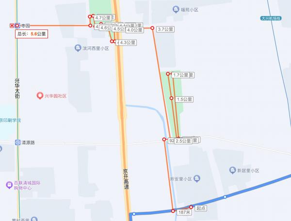 这次计划经过上次在终点的大兴海户公园,然后过5环到康庄公园,最后可以在枣园地铁站旁边的麦当劳吃饭。路线: