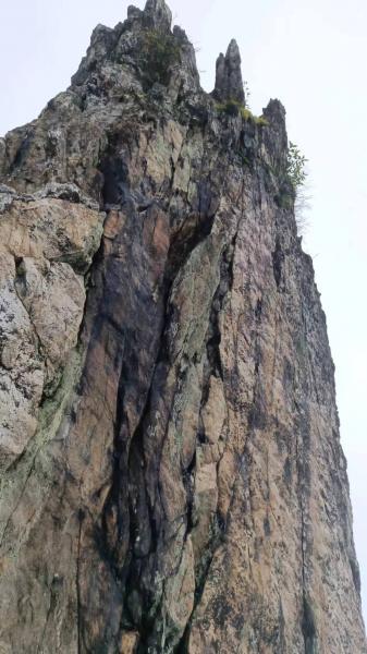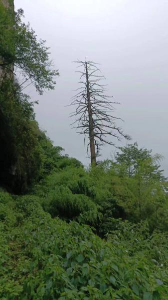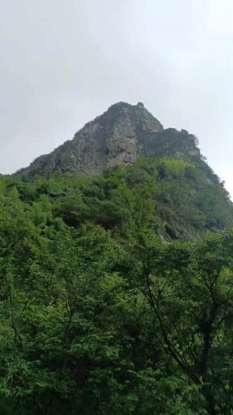 笫二天,高挂山。新宁县第三高峰,海拔1672米。 又名钩挂山,高冠山,本地人俗称大顶山或者老岩, 是紫江河的发源地。古时徐霞客经过此地,见此山高耸如钩,叹“甚奇突”,由此而命名。