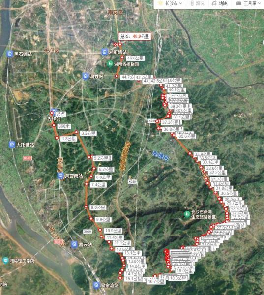 然后在在石燕湖南边绕一个圈,经洞株路返回长沙