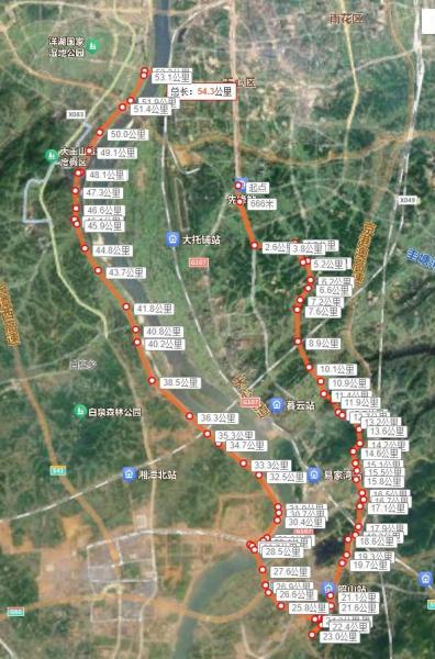 中信广场-环保西路-港子河路-万家丽南路-月塘路-新韶山南路-昭华路-昭华大桥-沿江北路-潇湘南路-湘府大桥-黑石铺。
