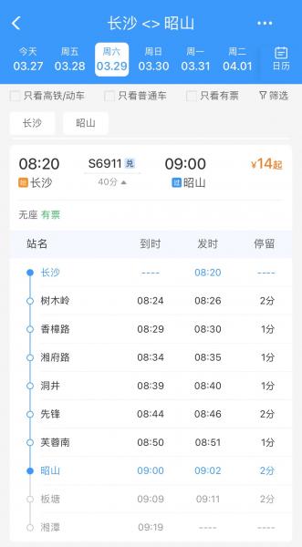 1. 到达昭山城铁站,可公交、城铁,也可以自驾。本人准备乘S6911(8:20)长沙-(9:00)昭山。请高德地图或铁路12306搜,各自釆用自己喜欢的方式就近乘车,到时我们在昭山城铁站再汇合。返程也可城铁或公交;