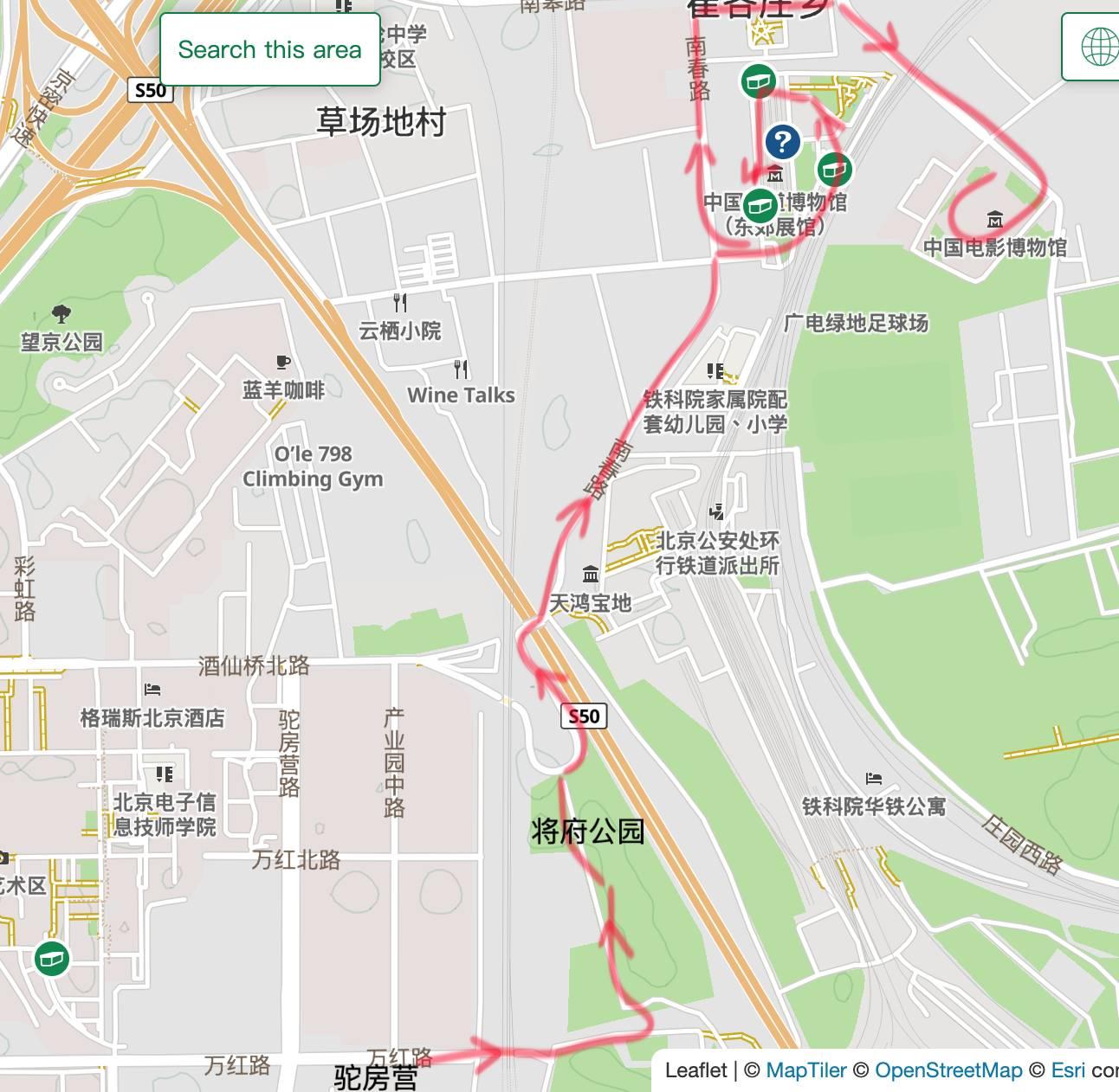 出走区域在著名的798、草场地园区之间,会途径将府公园北区,目标是两个博物馆,寻找铁道博物馆里的几个Geocaching宝,然后电影博物馆看一眼。