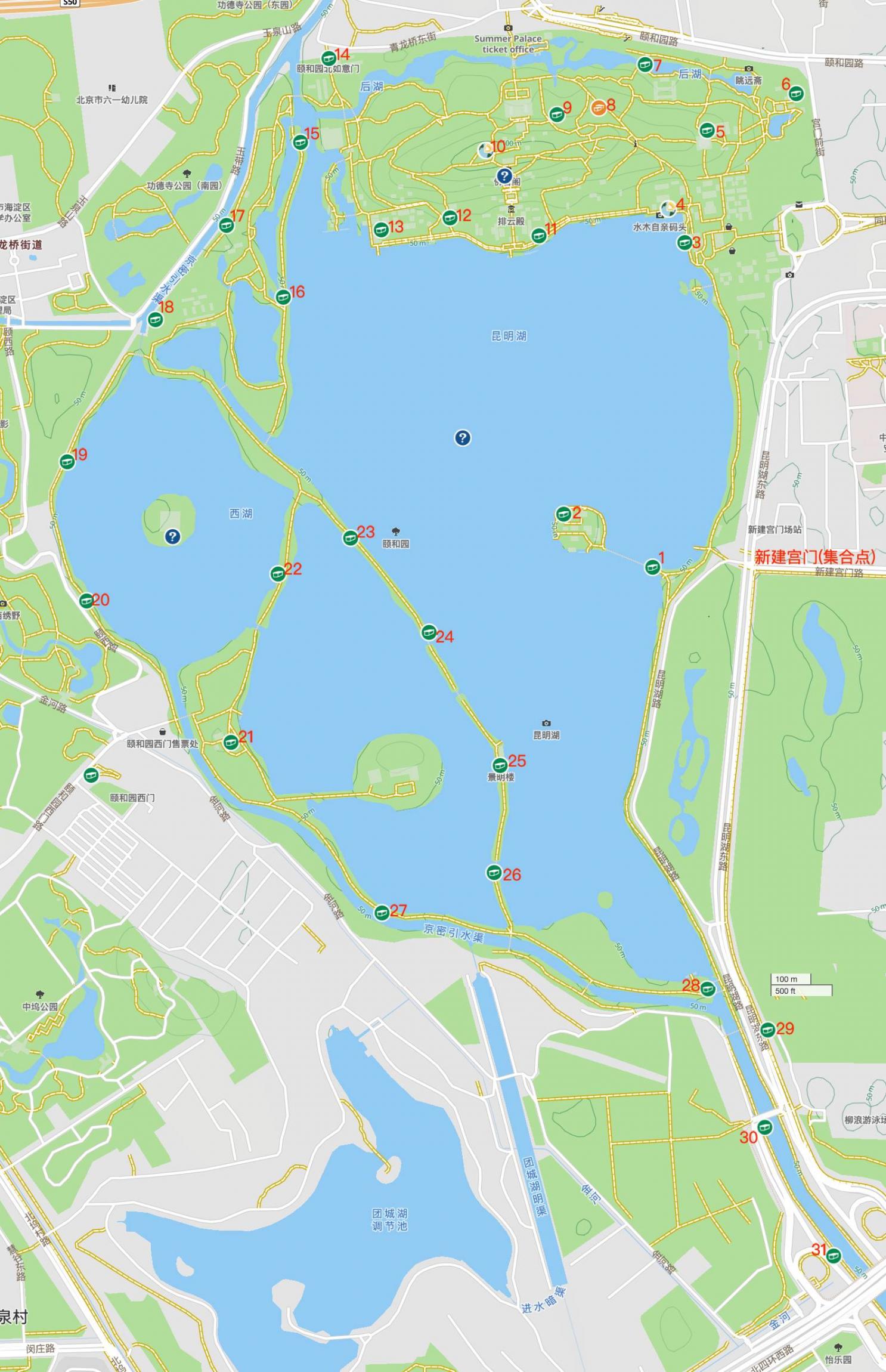 课题从新建宫门开始,逆时针方向绕园一周,在南如意门结束园内寻宝。出如意门还有三个河边宝可以顺道解决。31号宝距离地铁巴沟站已不远。