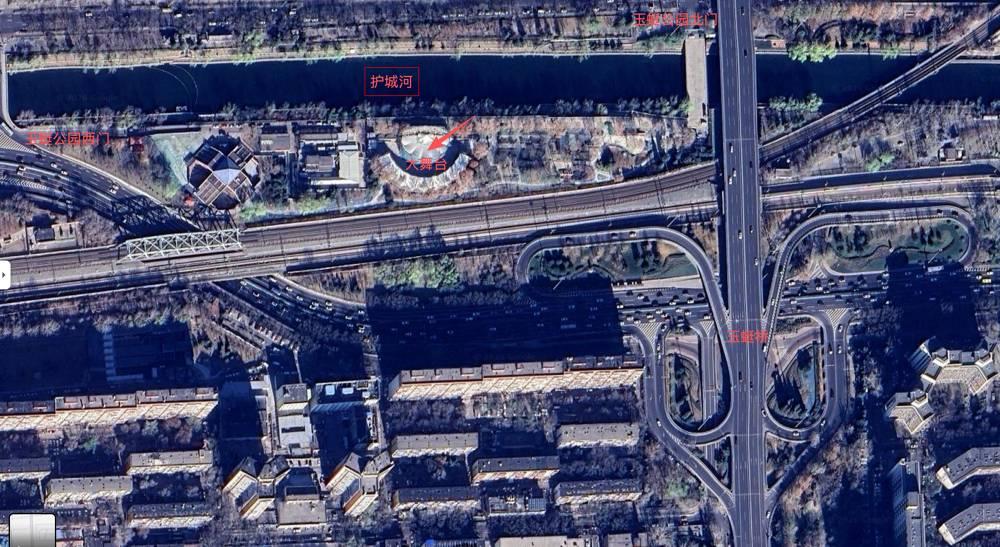 注意:集合地点在玉蜓公园内的半圆形大舞台。玉蜓公园有东北门和西门两个门可以进入,从护城河南岸的步道也可以直接进入公园。下图是谷歌卫星图标记的集合地点: