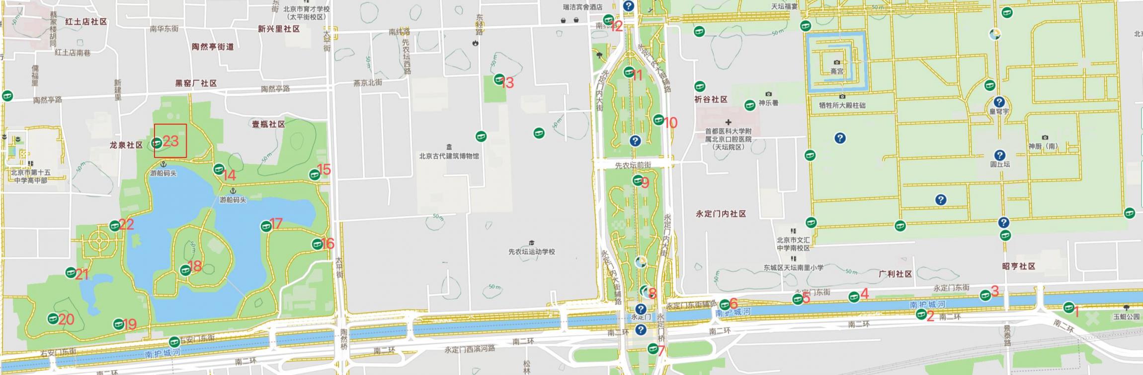 南护城河沿岸最近有一些新的Geocaching宝,而且不乏新鲜的藏法。我们第一阶段南护城河寻宝。到永定门城楼转向北进入第二阶段,沿着中轴线寻找几个十分经典的伪装宝。在天坛公园西门处向西拐入南纬路,经过先农坛,到达陶然亭,在公园内完成最后一个阶段寻宝。