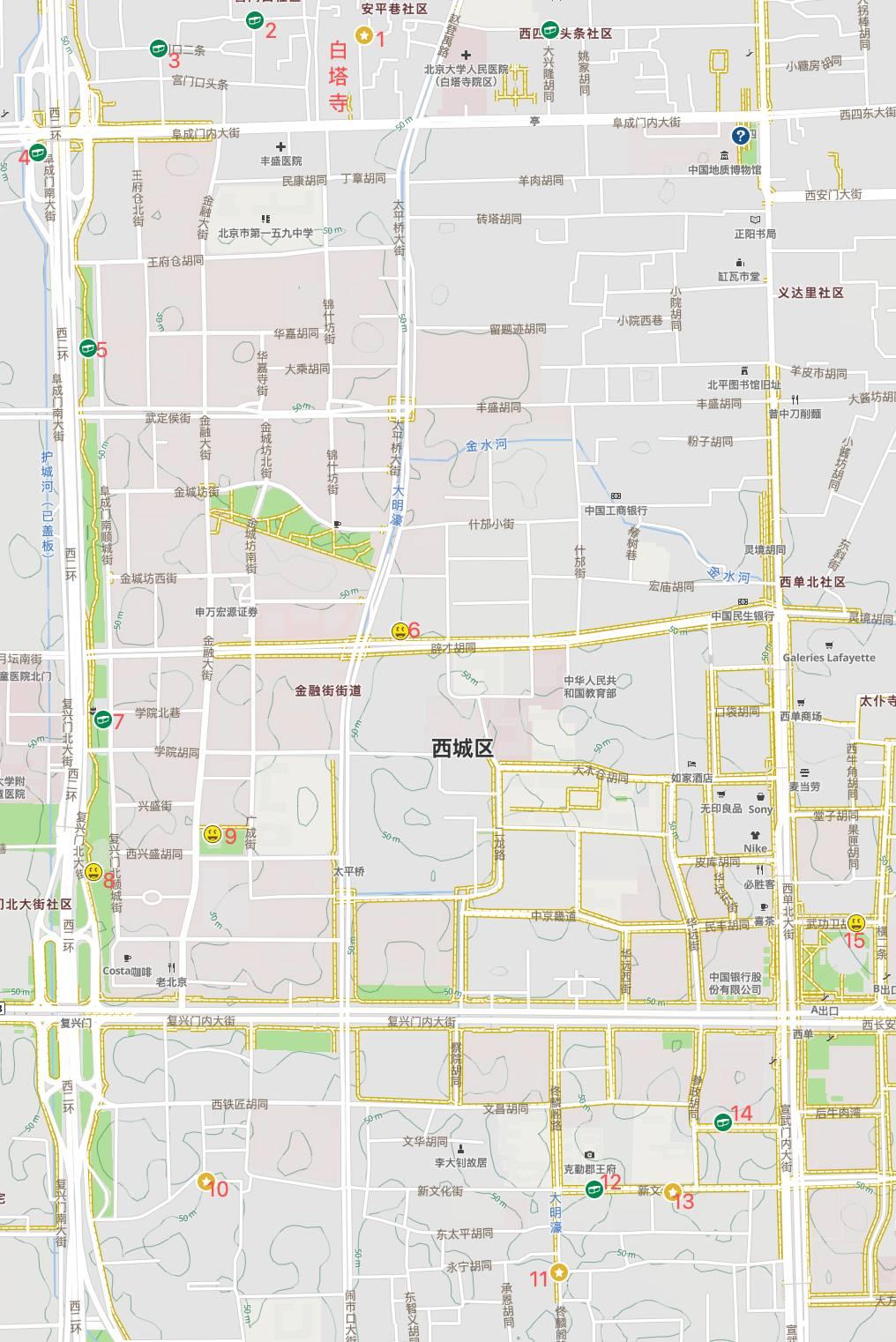 到阜成门向南,我们顺着西二环继续寻宝,期间拐进二环内齐白石故居看一眼。然后经都城隍庙向南过长安街,到鲍家街43号,中央音乐学院。拐向东,过新文化街、佟麟阁路的几处近代古迹,最后到达西单,结束课题。