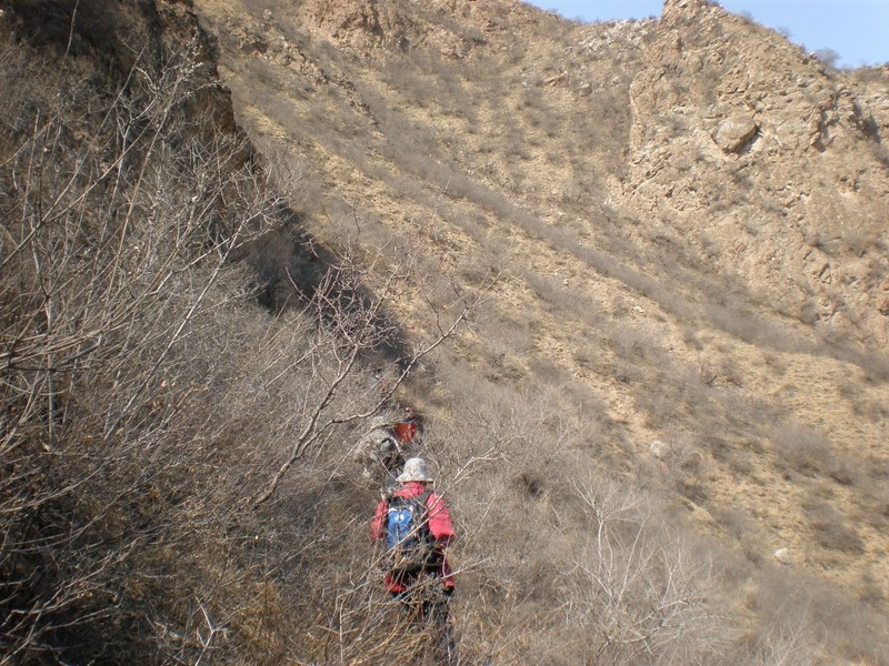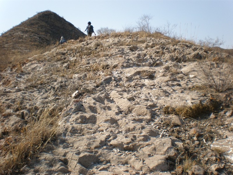 在上次出走时,我注意到旧庄窝通往黄骆驼的山谷靠近谷口一段北侧山坡上有一条规模不小的路,从远处看,属于驮道甚至机耕道,有石砌的路基。这条路由谷口向内约500米处开端,在北侧山坡上向东横切,直到谷口北侧的A点,拐弯离开我的视线,去向不明。