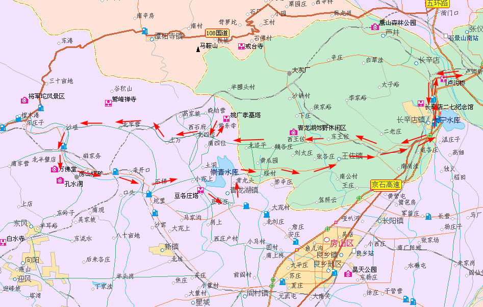 骑行路线:卢沟桥—长辛店—朱家坟—云岗—西王佐—北洛平—常乐寺—北四位—上万—北车营—房山煤矿—坨里—小苑上—豆各庄—青龙湖镇—怪村—王佐镇—云岗—朱家坟—长辛店—卢沟桥。