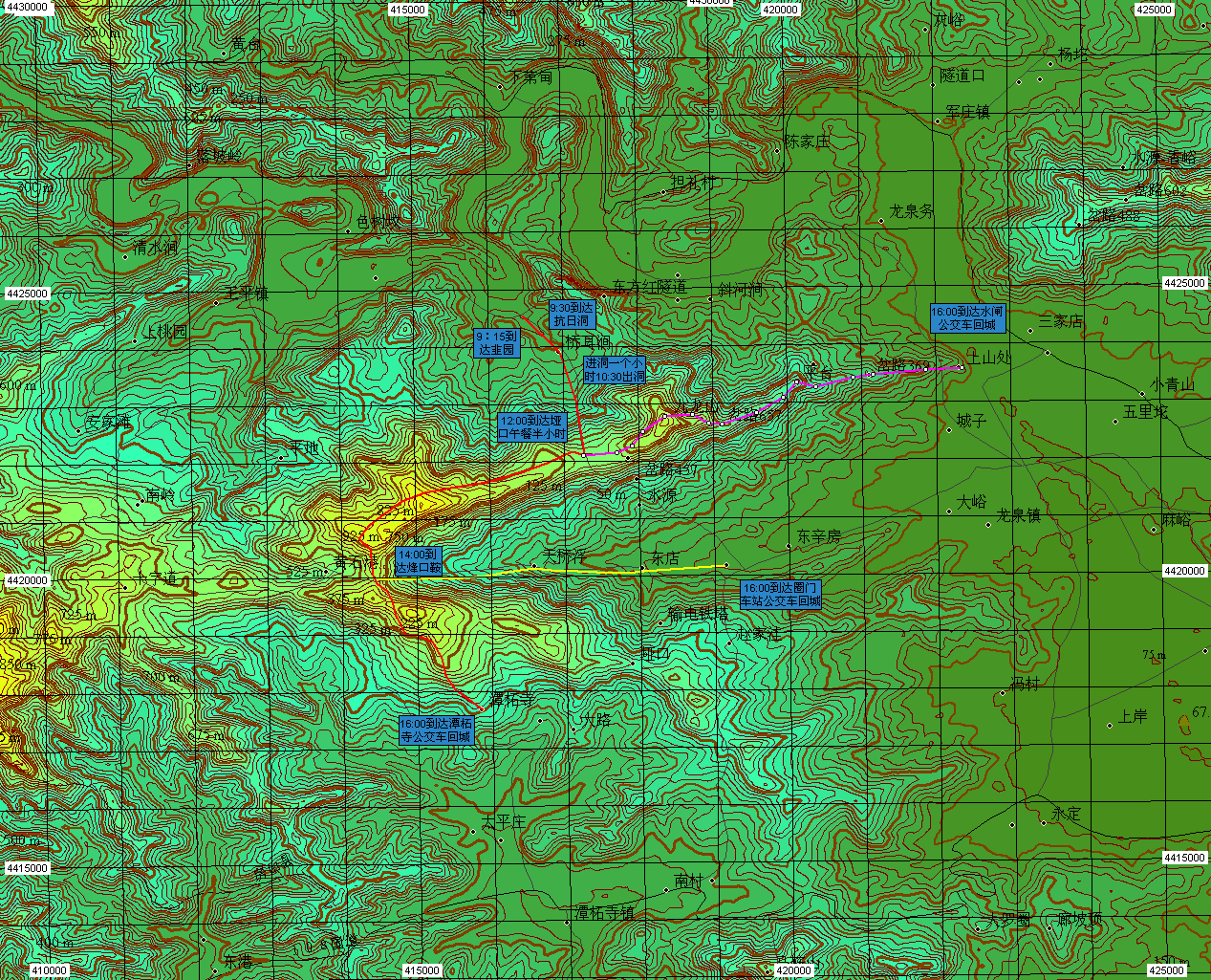 以下分别是红色、黄色、粉色路线的高程、距离数据图以及另一张平面地图:
