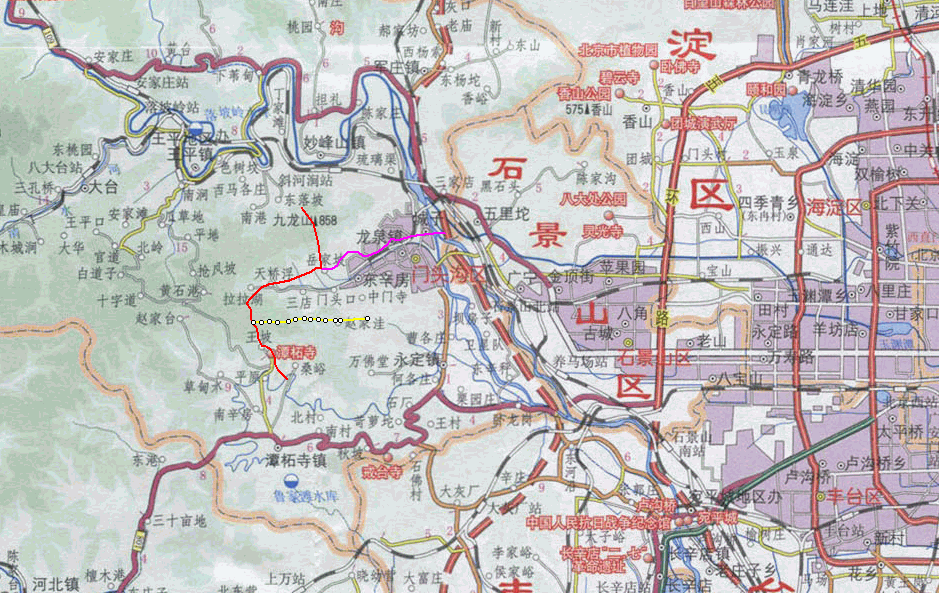 红色路线为首选路线:抗日洞-潭柘寺。