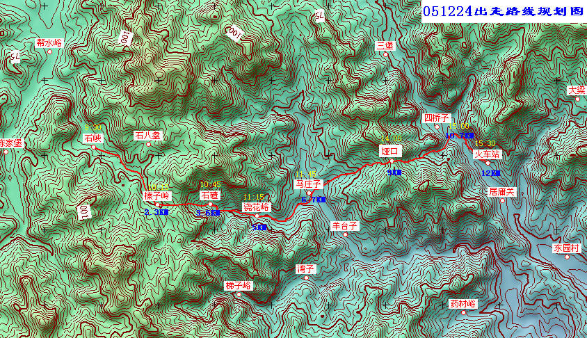 起点石峡村位于长城附近,下车后,可以仰望一下长城,然后由此向东,沿沟上升至垭口,沿响潭沟支沟下降,经过石碴、浇花峪,进入响潭沟主沟,中午在沟内的马庄子村附近休息、吃午饭,然后沿马庄子东侧的支沟缓缓上升,至垭口,沿关沟的支沟下降,到关沟主沟,过桥洞,走与公路平行的小路到居庸关车站,然后乘7174次列车返回北京。