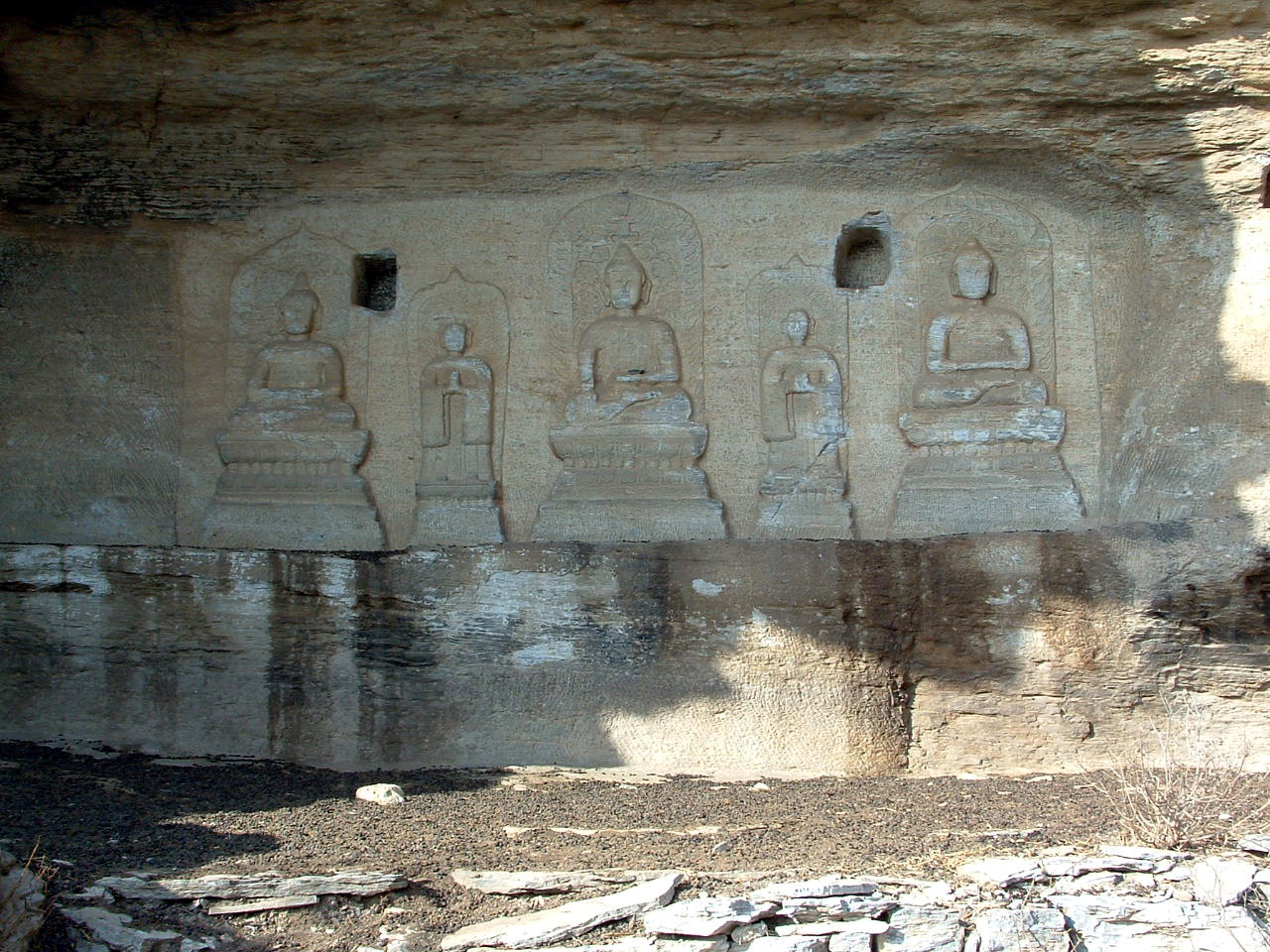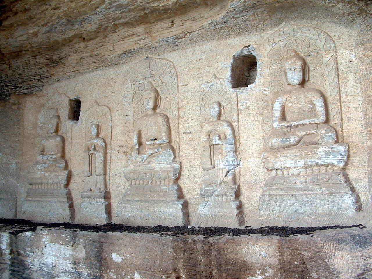 (2)大峪沟造像:位于大峪沟村东侧坡地上。青石断面依崖向南,在两龛造像。右侧一龛高0.88米,宽0.98米。中为释伽牟尼坐像,两侧列众弟子和金刚力士,顶面有二飞天。此龛造像共9尊,形态各异,栩栩如生,亲切动人。左侧一龛高1.7米,宽0.85米。此龛只有一尊造像:释伽牟尼端坐于须弥座上,面方口阔,双目微睁,两耳垂肩。。。。。。据考证,为唐代作品。