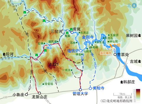 1、龙庆峡-古城河-后河:这是一组混乱的地名,在户外社群,它们一直被混乱地使用。在官方出版的地图上,蜿蜒于延庆盆地北缘低山地带的这条河叫古城河,这条河上游分为南北两条,从宽度、流量、河道曲率这些角度来观察,这两条河没有太大的差别,很难说哪一条是干流、哪一条是支流,实际上,地理学家们恐怕也没想弄清楚,地图上标注名称时,耍了滑头,“古城河”三个字是标在上游两条河交汇处以下的,由此可见,上游两条河都可以视为古城河的上源,我曾经试图分别命名为南古城河、北古城河(模仿尼罗河上游的白尼罗河、青尼罗河),但没人多少人采用,或许是嫌长。说完古城河,再说龙庆峡。80年代初,古城河出山处筑坝蓄水,建成古城河水库,最初纯为水利工程,若干年之后,延庆人民发现了古城河水库的旅游价值,于是给它改了个古雅的名字龙庆峡(因为延庆古称龙庆)。回过头来再说后河,刚才说了,古城河上游分成两条,北边这条,现在很多人仍叫它古城河,南边这条,则改了名字,其中一个比较占上风的名字是后河,其实后河本是这条河边一个村庄的名称,现在村子已经荒废了,名字则给了这条河。当然,不是所有人都认这个帐,有一部分追求精确的同志,估计是知道后河其实不是河,不愿意混淆地理概念,于是造出一个后龙庆峡的名词,用来指代我所称的南古城河,由于这一派绘制了一张很经典的地图,在网上有一定影响,后龙庆峡这个名称也就名以图存,在小范围内传播着。考虑到后河的说法更为流行,本计划还是采用后河这一名词,请后龙庆峡派的同志见谅。后河一带是典型的峡谷地貌,水流深切柔软的石灰岩,形成峭壁和深谷尖锐的对比,因为发源于海拔2000多米、植被良好的山地,溪水的流量较大。盛夏时节,山壁和树木遮蔽了烈日,脚边是清冽的水流,是纳凉的好去处。更妙的是,这一带夹在西边的玉渡山景区和东边的龙庆峡景区中间,属于统治力较弱的三不管地区,可以尽情享受免费资源。