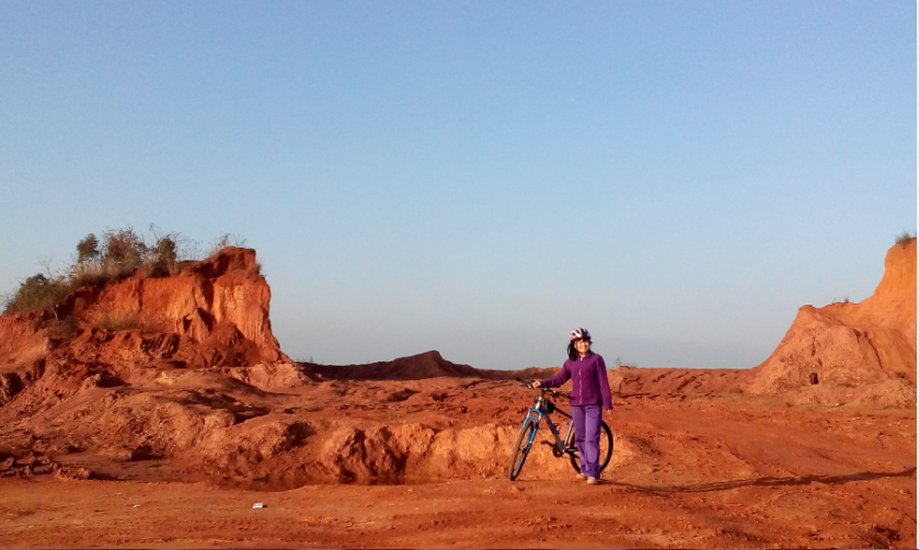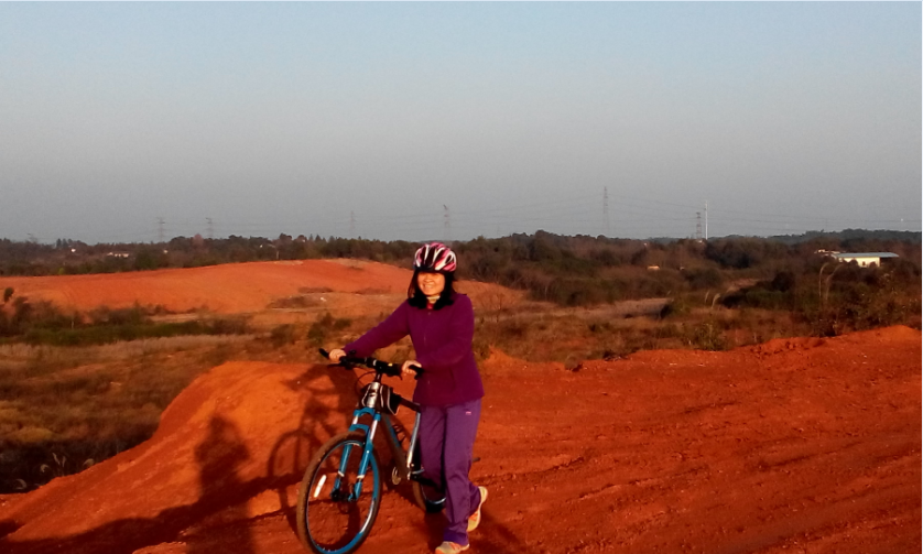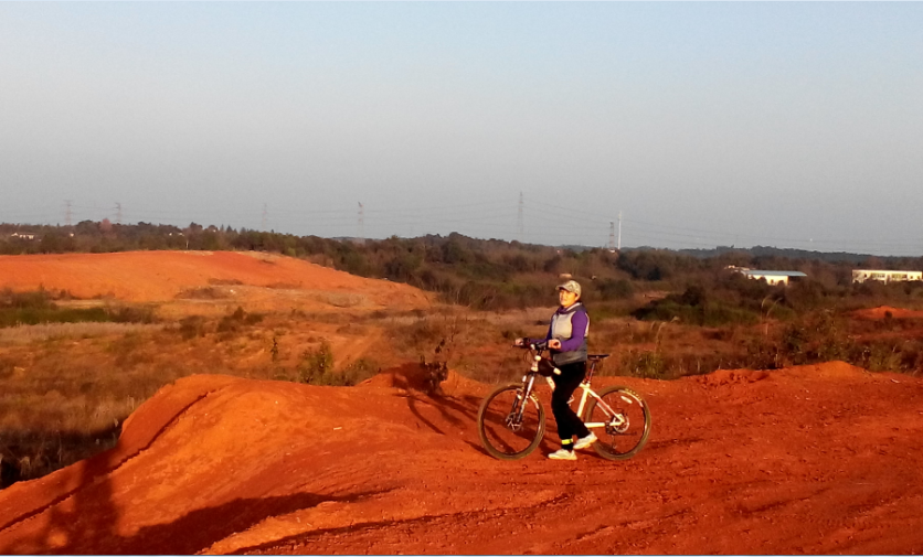 我背后有两条路,左边这条缓缓上升,几乎没什么幅度,珍飞姐姐(因为网站进不了,没能报上名)选择了这条路。而我毅然推着车走向右边那条堵坡的路。姐姐担心到了顶点便没有了路,而我认为车的痕迹这么明显,路肯定有。我们分道而行,没两分钟,我到了顶点,而姐姐还在下面踽踽而行(嘘,觉得不能用这个词喔)。