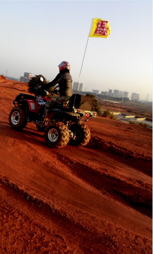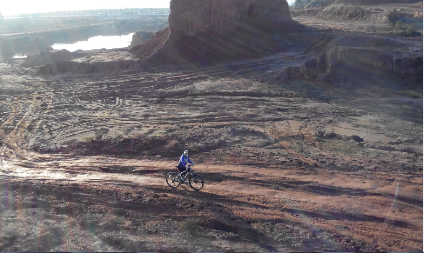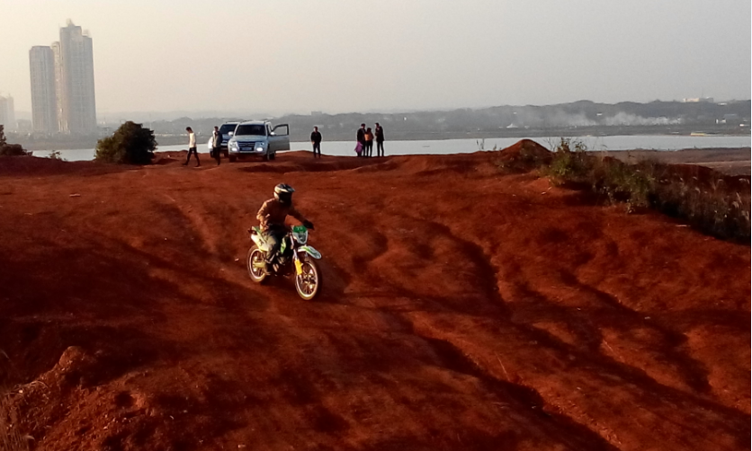 推着车,下了山丘,再上一个堵坡,我们正享受这赛道的新奇和冬日暖阳的时候,前方的山丘猛然间飞出来一台摩托车,高出地面一米以上,姐姐吓得惊叫,叫我赶紧搬车,给他们让道。我也惊叫,没想到电视里面经常看到的赛车镜头,现实生活中能有幸遇见,一个字“酷”。姐姐倒是更多地担心司机的安危。我们赶紧搬车上左边的小土堆,姐姐还紧张得滑了一下(这个我事后看到土堆边土有松动的痕迹,姐姐说了才知道的)。我预计得有几辆,赶紧拿出手机镜头对准,好想拍到摩托车冲上空中的感觉啊。但因为手机内存不够,好慢的。我没能拍到,遗憾。