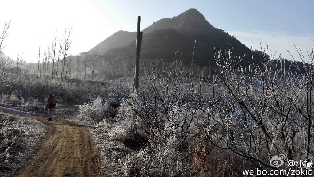 在10点钟之前,跟”我也是醉了“相伴使用的是”好美啊“,这是一段从豆各庄通往孙家沟的土路,翻过低矮的坡地,从果园和树丛间穿行,霜结在枯叶和枝条上,一片银白,大言不惭点,就是雾淞,再加上刚下车时阳光下还飘了点雪花,确实配得上”好美啊“。当然,我是身经百战了,不能像小姑娘这样溢于言表的,何况我还惦记着乘前一班车早我们20分钟出发的右尼们。他们4个凭着右尼制作的一张地图已经摸到了孙家沟,对,这个村名还是右尼老师在地图上获取的。我制订的路线图上都没标出它来。gpsies的地名库很小,我也没有很迫切地要把沿途村庄都搞清楚,路线那么简单,貌似我不必举轻若重,身经百战就要有身经百战的气度,不能像小姑娘那样在班车上就开始用手机导航,不过她是对的,我坚持到豆各庄下车而不是前一站,导致我们多走了500米,还要折回来。