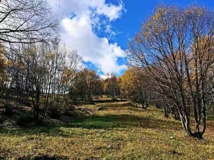 我们此后的路线基本上与规划路线吻合。昨天的一场雨洗净了天空,滋润了山林,空气沁人心脾,昨天的阴郁一扫而光。整齐的落叶松,林间小路铺满松针,脚感恍若地毯。漫山的白桦林在蓝天下金光闪烁。回首北望,苍穹下的天际线平缓地左右延展,一座座洁白的风车随着山峦起伏。