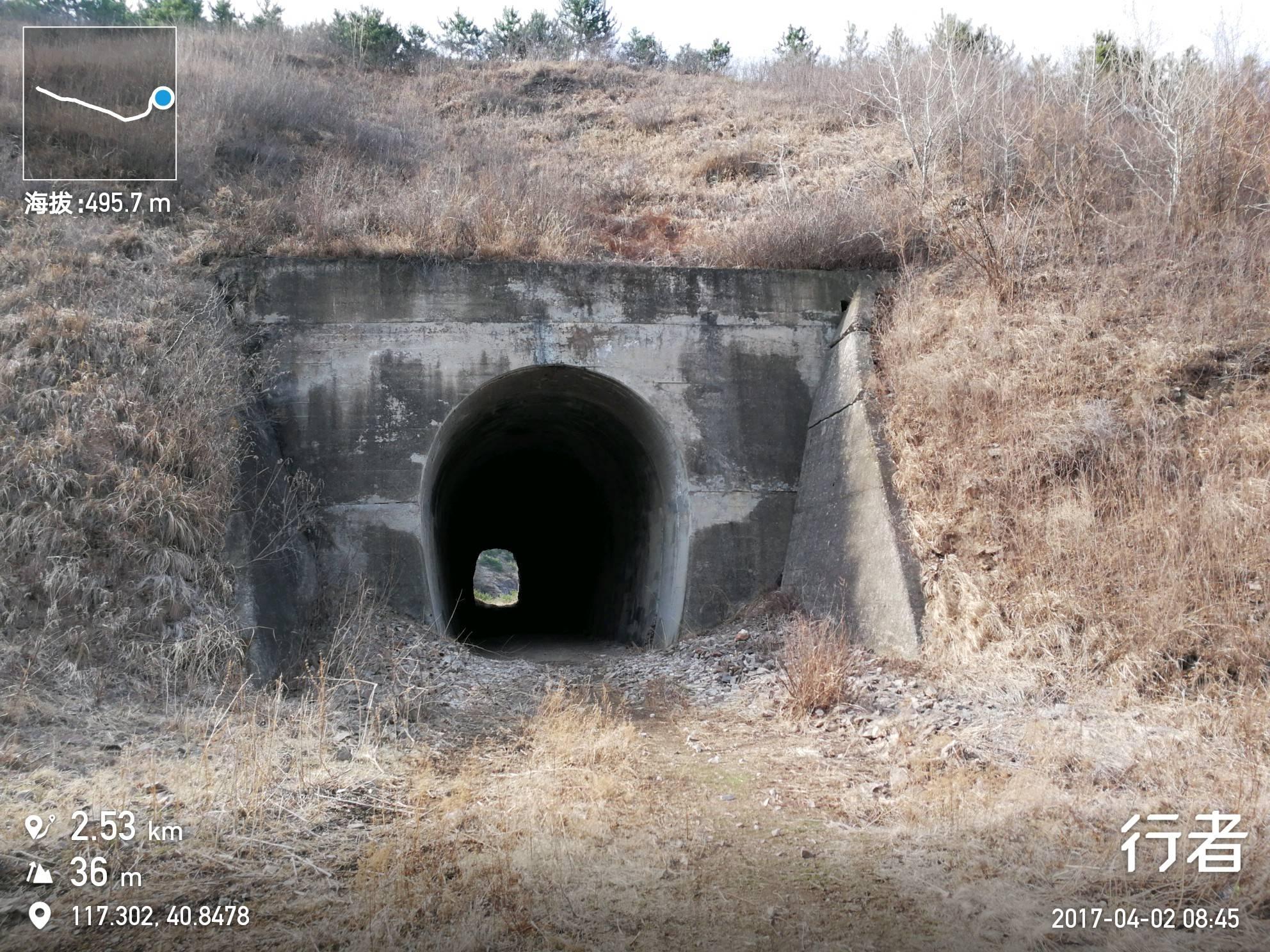 大北沟村口,一位热心的女孩向我们指点了右转上山的一条小路,沿着它走上去,很快看到了隧道口。1号隧道比较短。
