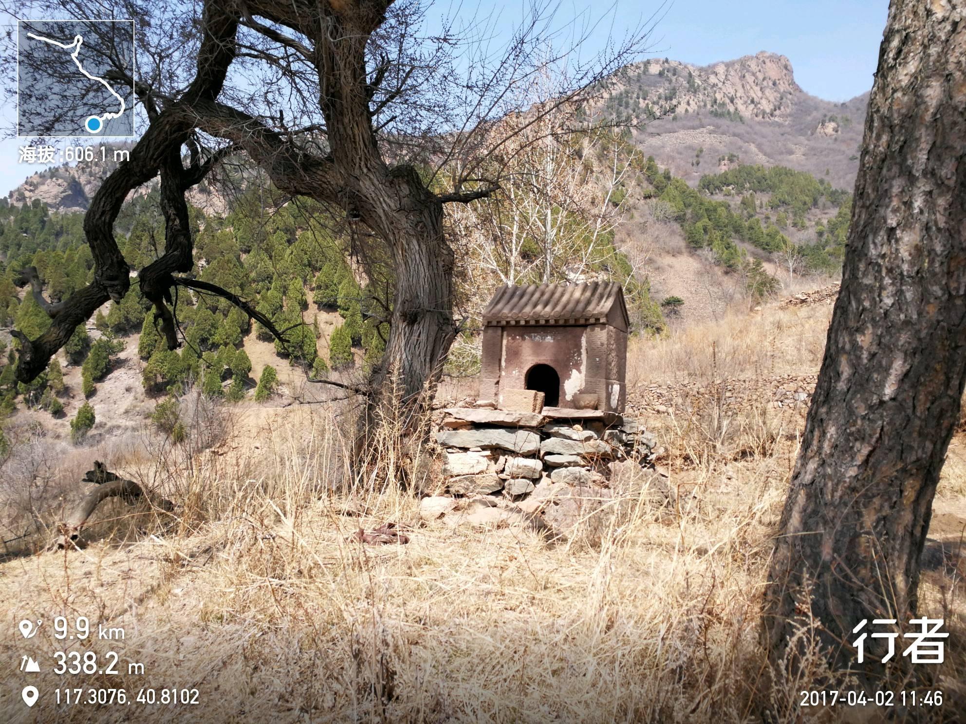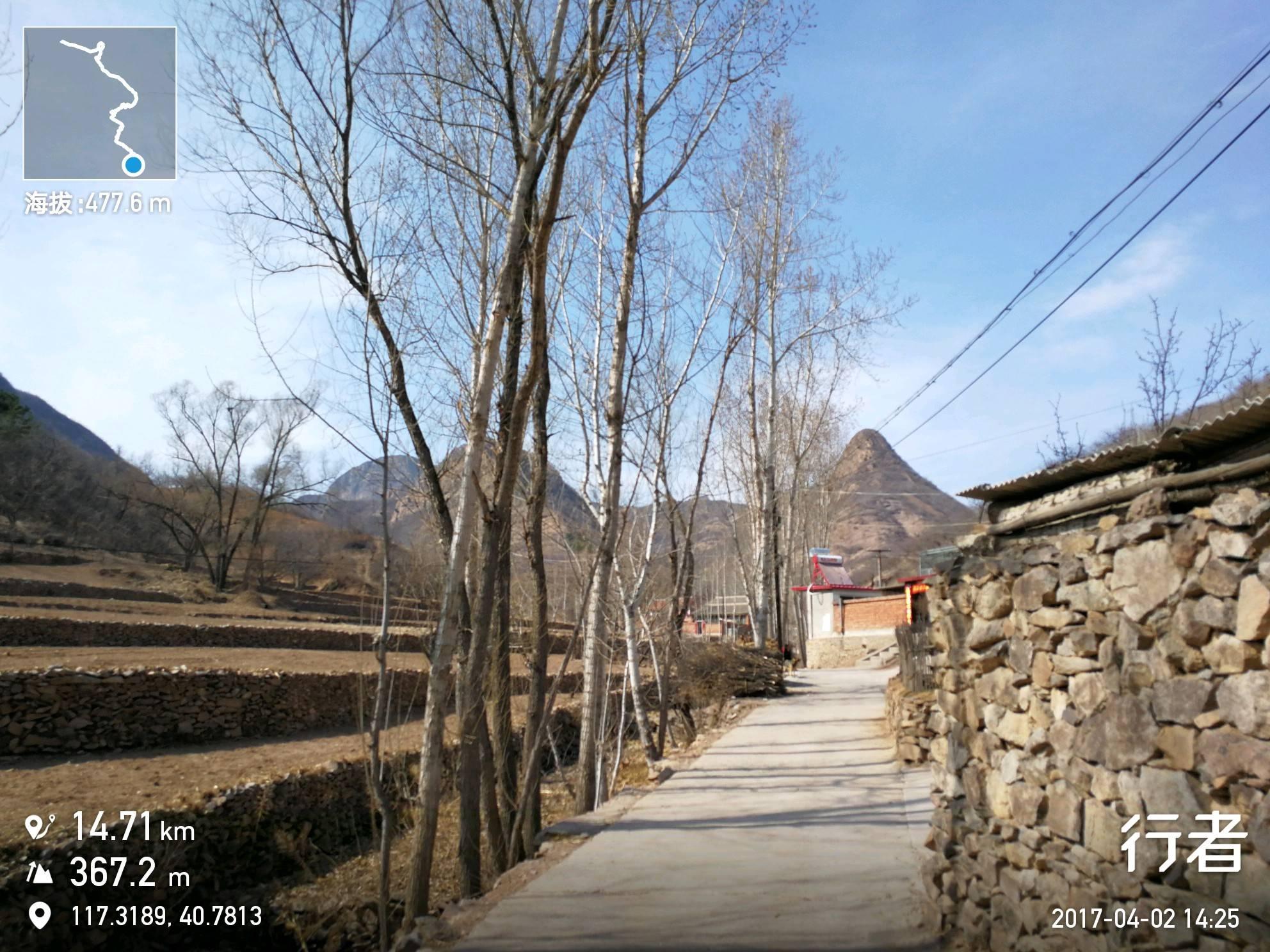 我本来打算按照设计好的轨迹顺着水泥路下降,并且已经走了约100米,但小庙南侧那条横切的村道吸引着我,谢大哥貌似说了一句,那条路通往两间房。我突然决定折返小庙,沿那条村道翻山。