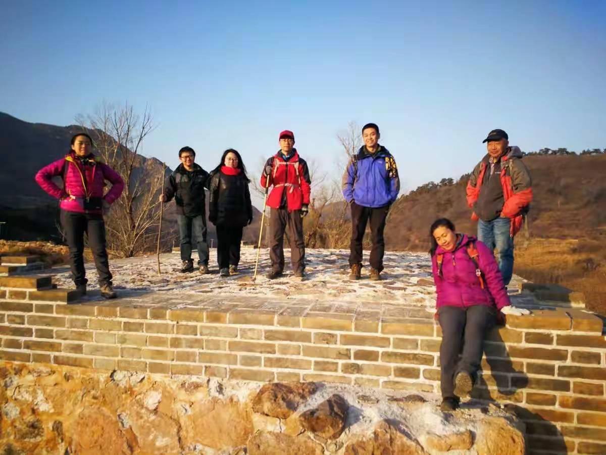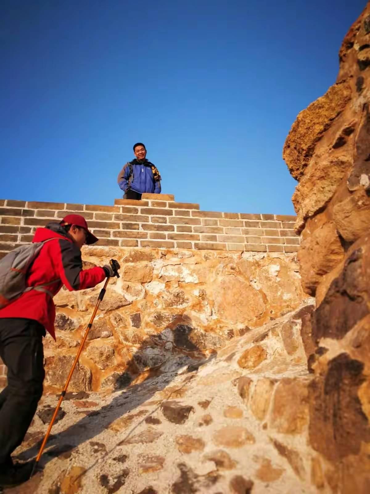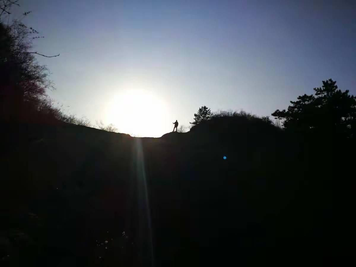 由山脊稍往下降,就开始了一段横切,这条小路向沟里延伸,与景区大循环的回路相连。我们默默地在山谷的阴影中走到一个岔路口,左转,回到阳光下,再往上走了一会,找到一片开阔地,开始午餐。海运从老家带回来的煎饼,我吃了一个,顺便一起脑补了一下老家的各种食品——大烧饼、锅饼、缸贴子、糁、辣汤、粥(特指豆面熬的粥)。对故乡的种种习俗,我大多持鄙弃态度,唯独对食品情有独钟,甚至离家之前很少吃的煎饼离家后也改变了态度。