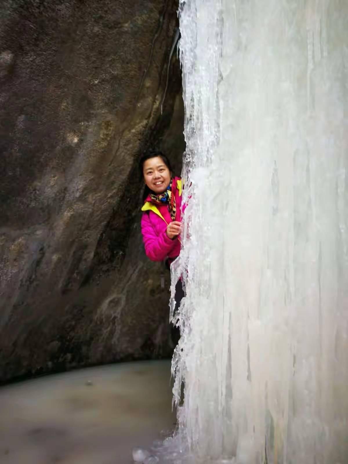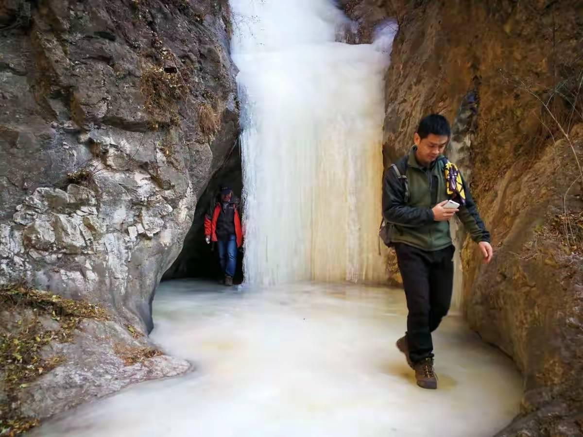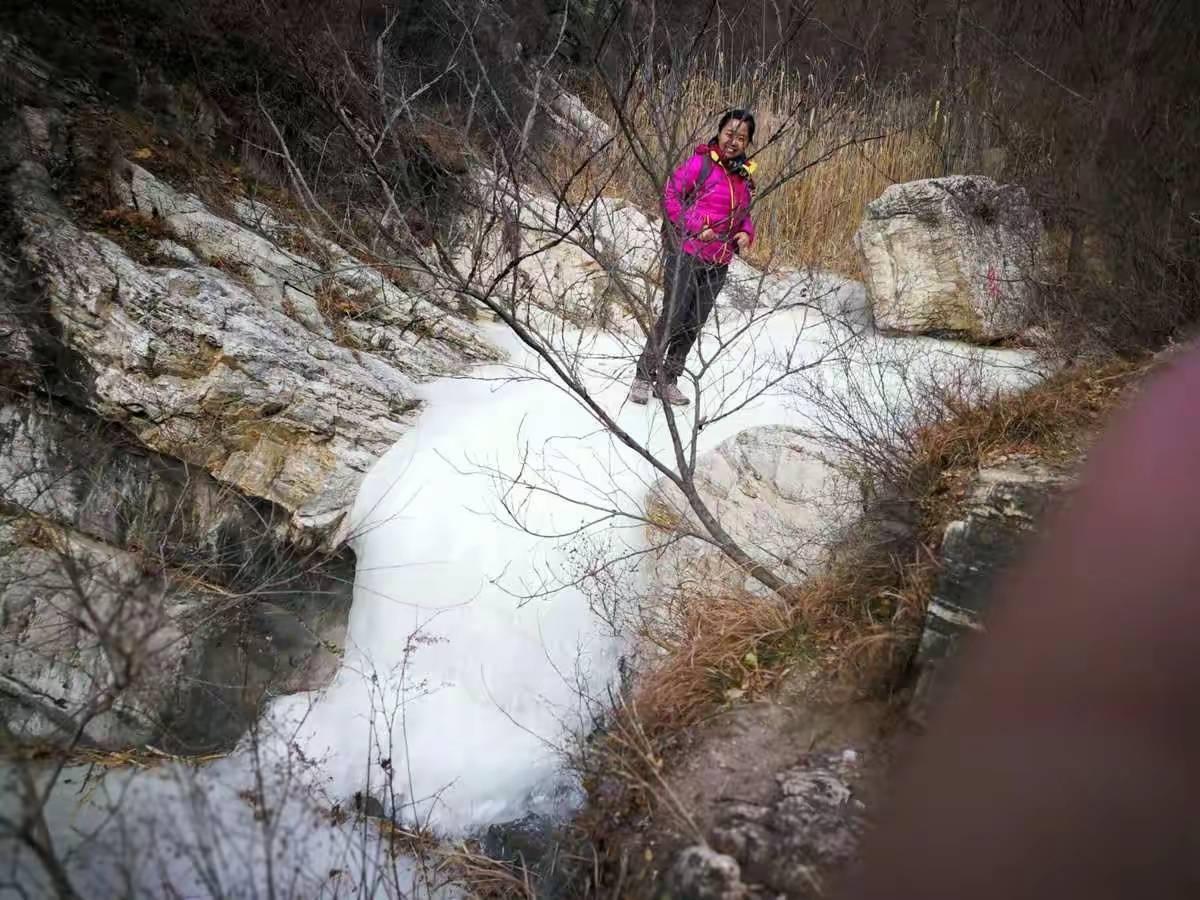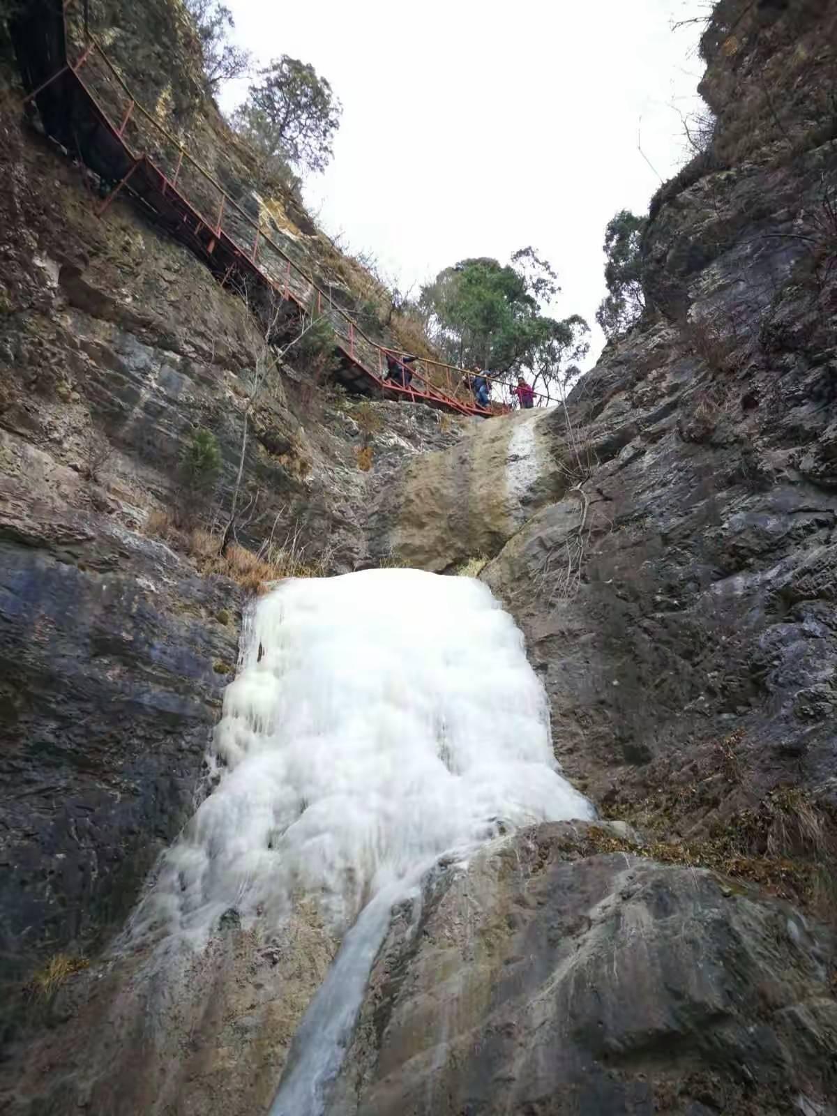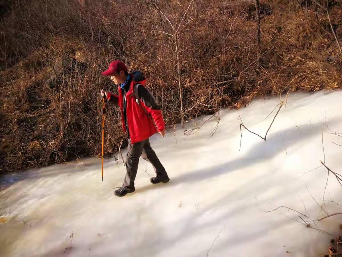 翻过垭口,又进入了山谷的阴影,沿着沟下降了一会,看到了景区的路标。第一个潭连名字都没取,上方的水源旁边,石头上写着一个“泉”字。水由泉涌出,落进下方的潭,当然,现在是一个冰瀑,落差不足两米。这只是开始,或许不算十八潭之一。钻过一棵倒卧的枯树,踏上陡峭的铁梯,才进入真正的十八潭。它是由一连串落差从5米到20米不等直上直下的石壶构成的,瀑布直落进下方的岩坎,浚急的水流在岩石上凿出一个深潭,可惜,现在水太少了,已经不够溢出“澡盆”形成冰瀑,只是在潭里缩着。那些曾经挂着瀑布的岩壁,就像空了的画框。记得第一次来这里,那些“画”都还在,4年的时光,偷走了它们。水和时间一样,是最容易流逝的东西,稍不注意,就枯竭了。