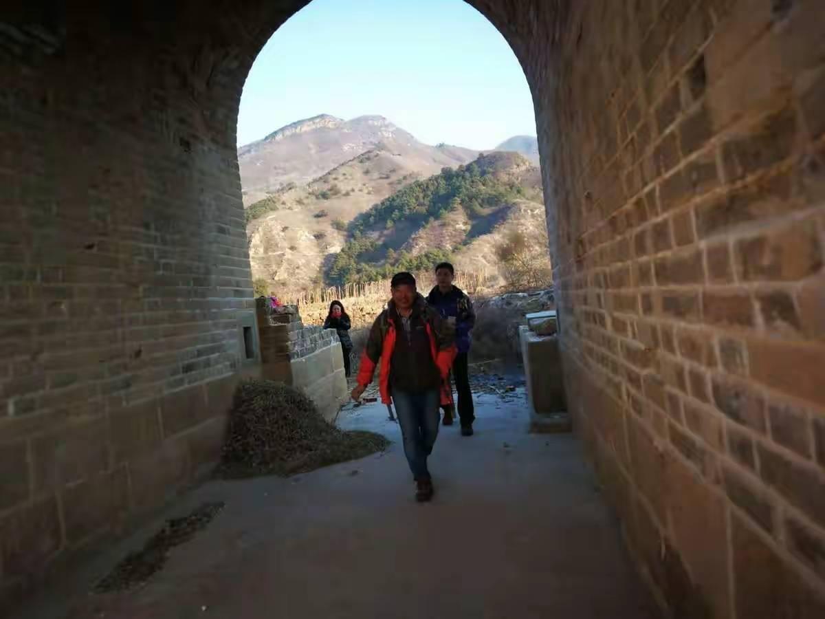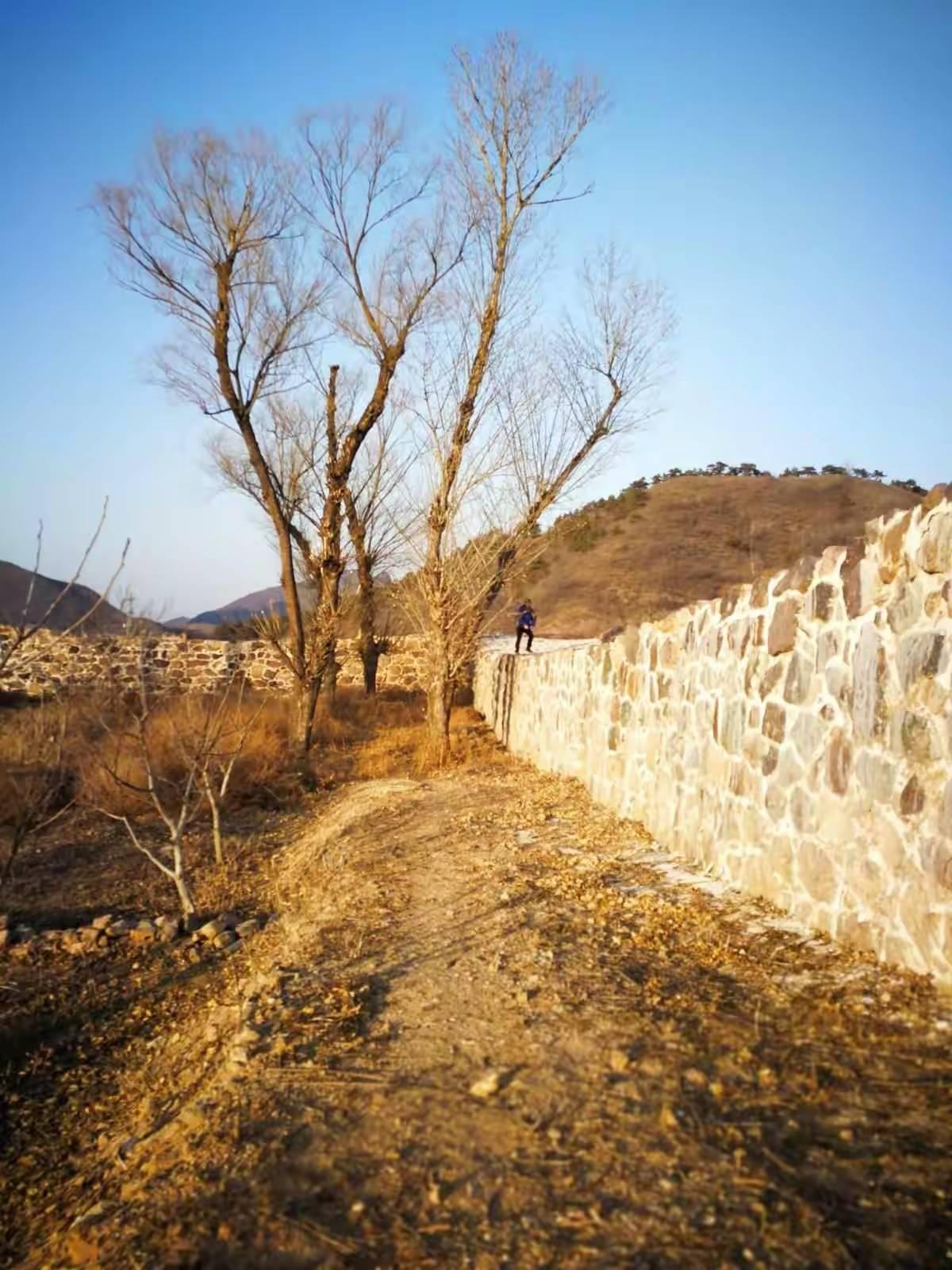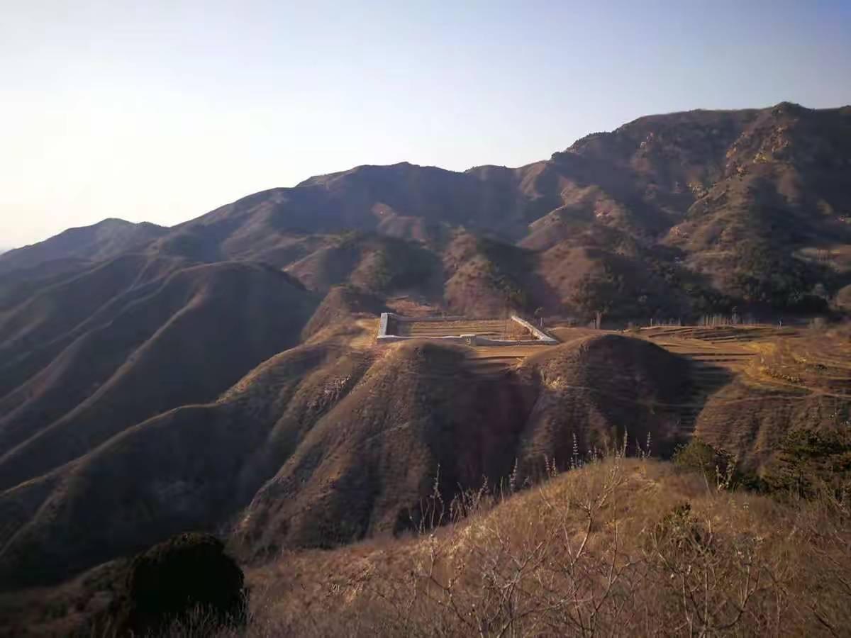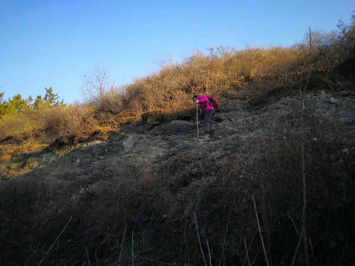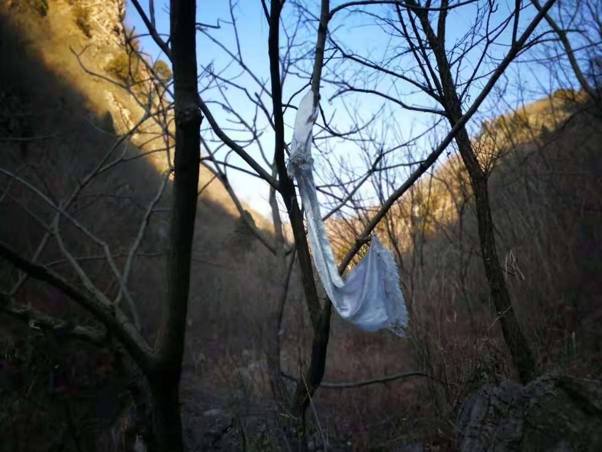 4年前,还没有好的手机地图应用,并没有记录下当时的轨迹。完全凭借不靠谱的记忆,使我们钻进了山坡上的一片灌木封锁下的梯田,癸哥和代代强行突破,远远地把我们甩在后面,我不舍自己的围巾和羽绒服,下令原路撤回村庄。站在高处的癸哥也帮我们确认了村庄内侧的沟里有路通往左侧的山脊。这其实就是我4年前走过的路,但已经完全没有印象,直到登上山脊,俯瞰左下方的景区,我的记忆才被唤起。