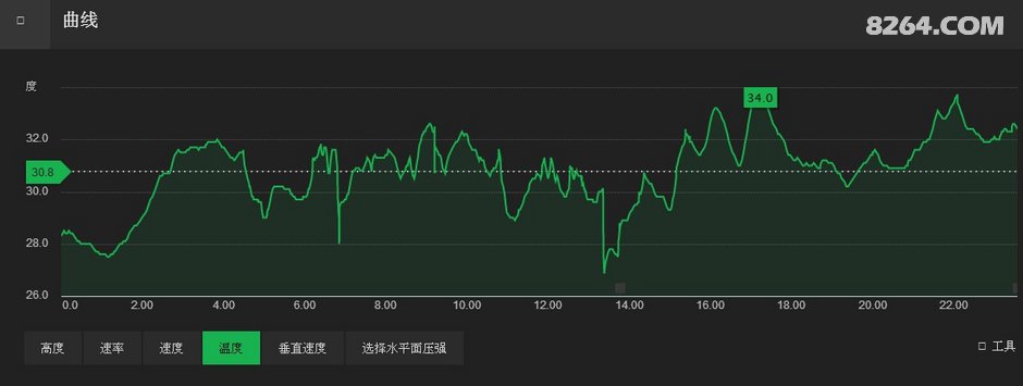 天气预报最高气温是27度,但我的手表记录的温度变化曲线表明,最高温度是34度,说明气温是比较高的