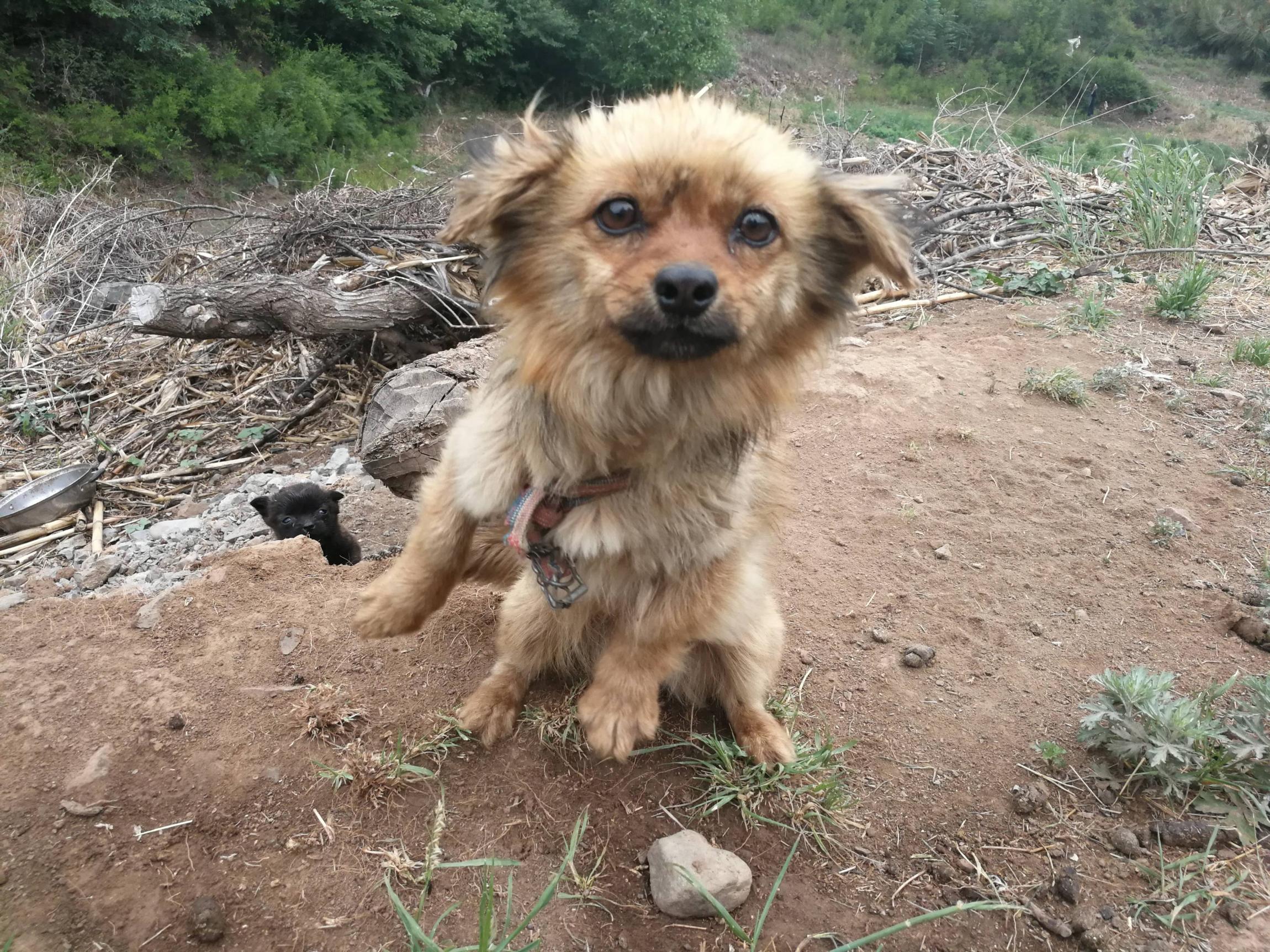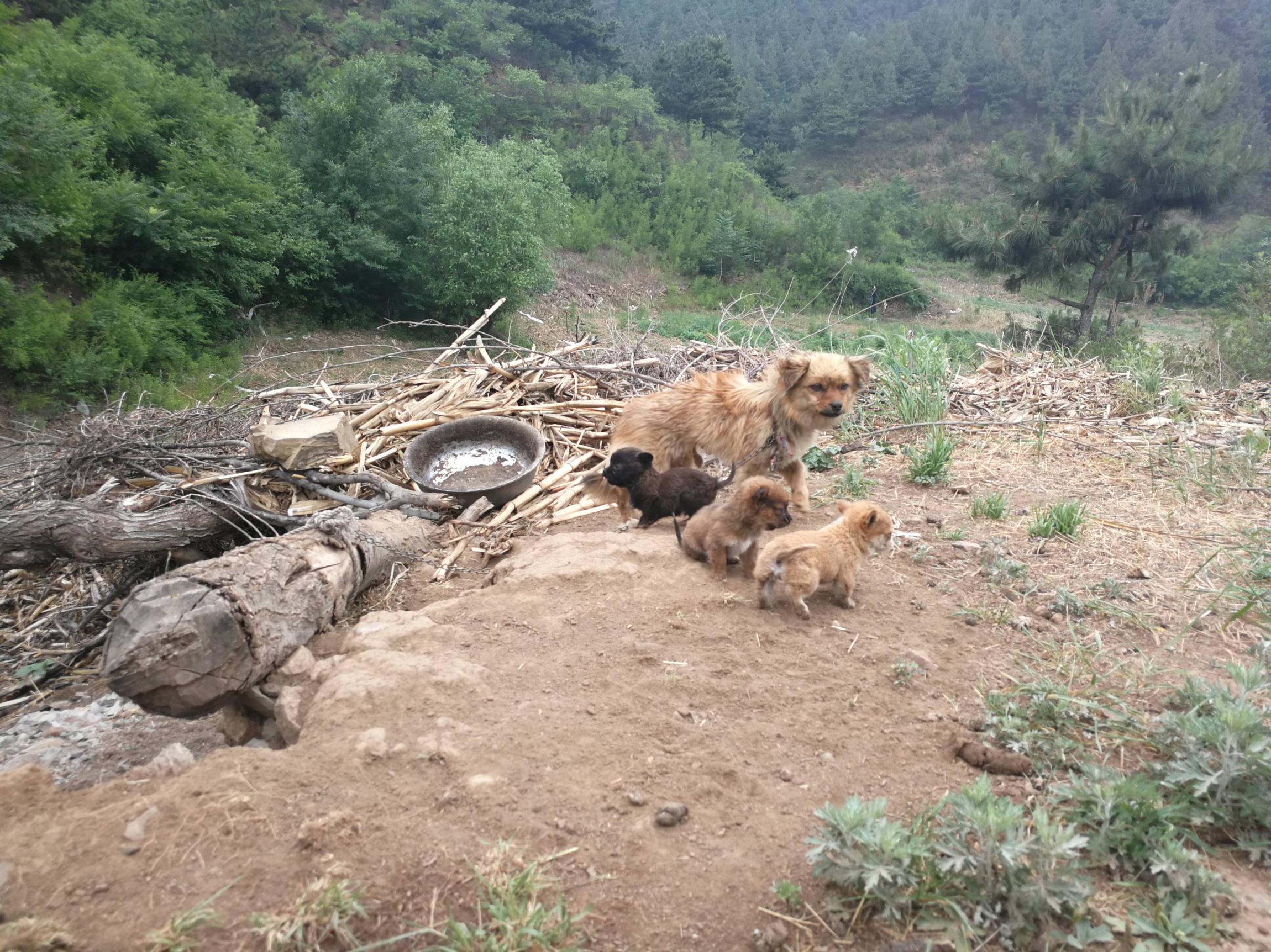 三条出生不久的小狗,像毛茸茸的小球,欢快地迎着我们滚动过来。它们的母亲,被一条铁链拴着,抬起前腿,向我们发出警告的叫声。它的身后一个简陋的窝。