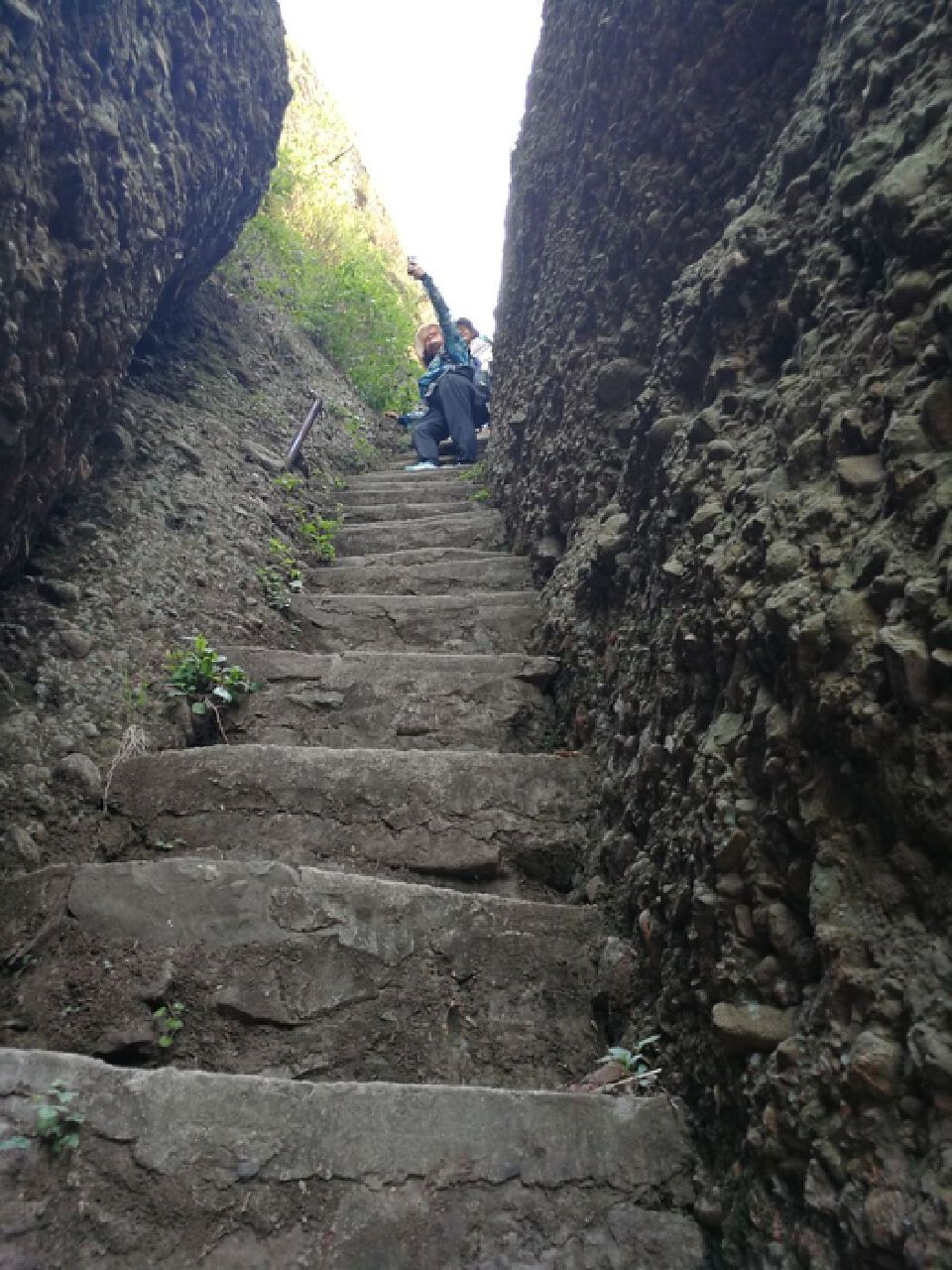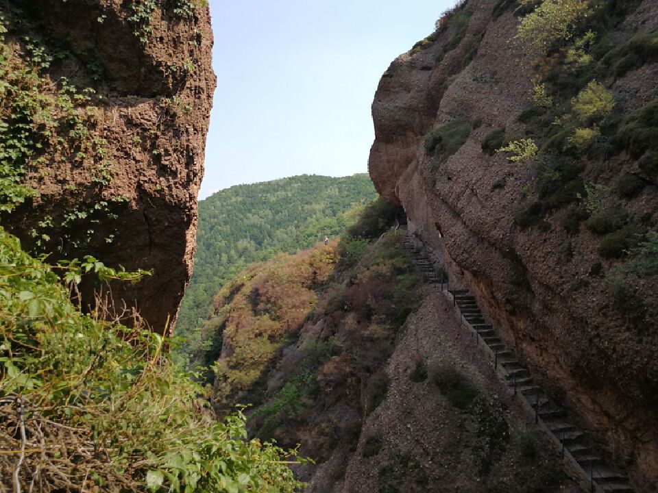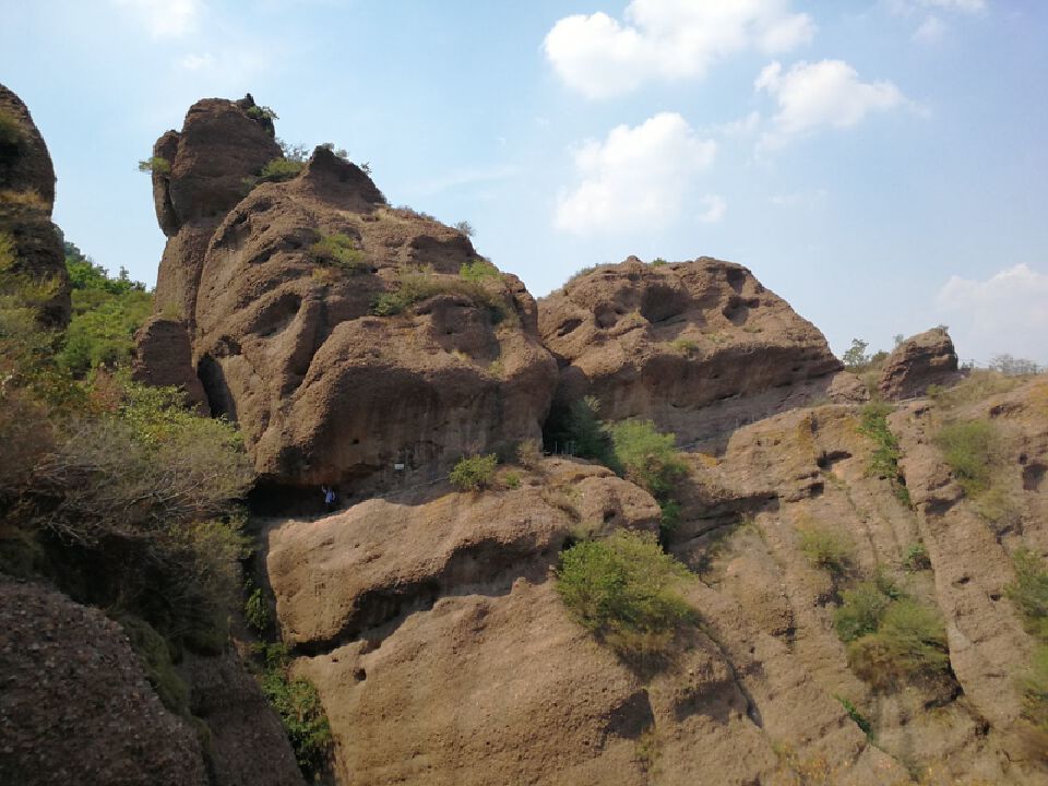如果没有景区的开发者,我们无法接近这些石头怪兽。峭壁侧面的栈道,石缝中超过75度的石级,旁边的铁链子都被拾荒者捡走了只剩下间隔2米的铁棍,这个曾经花费巨资悉心建设过的景区不知道有没有收回投资。山上只有我们6个人。上次来,也只有我们3个人。虽然山下就是国道,碧霞山却是寂寞的,如果没有广告和促销,就没有人在意它,也没有人向往它。那些来过的人,会惦记它吗?