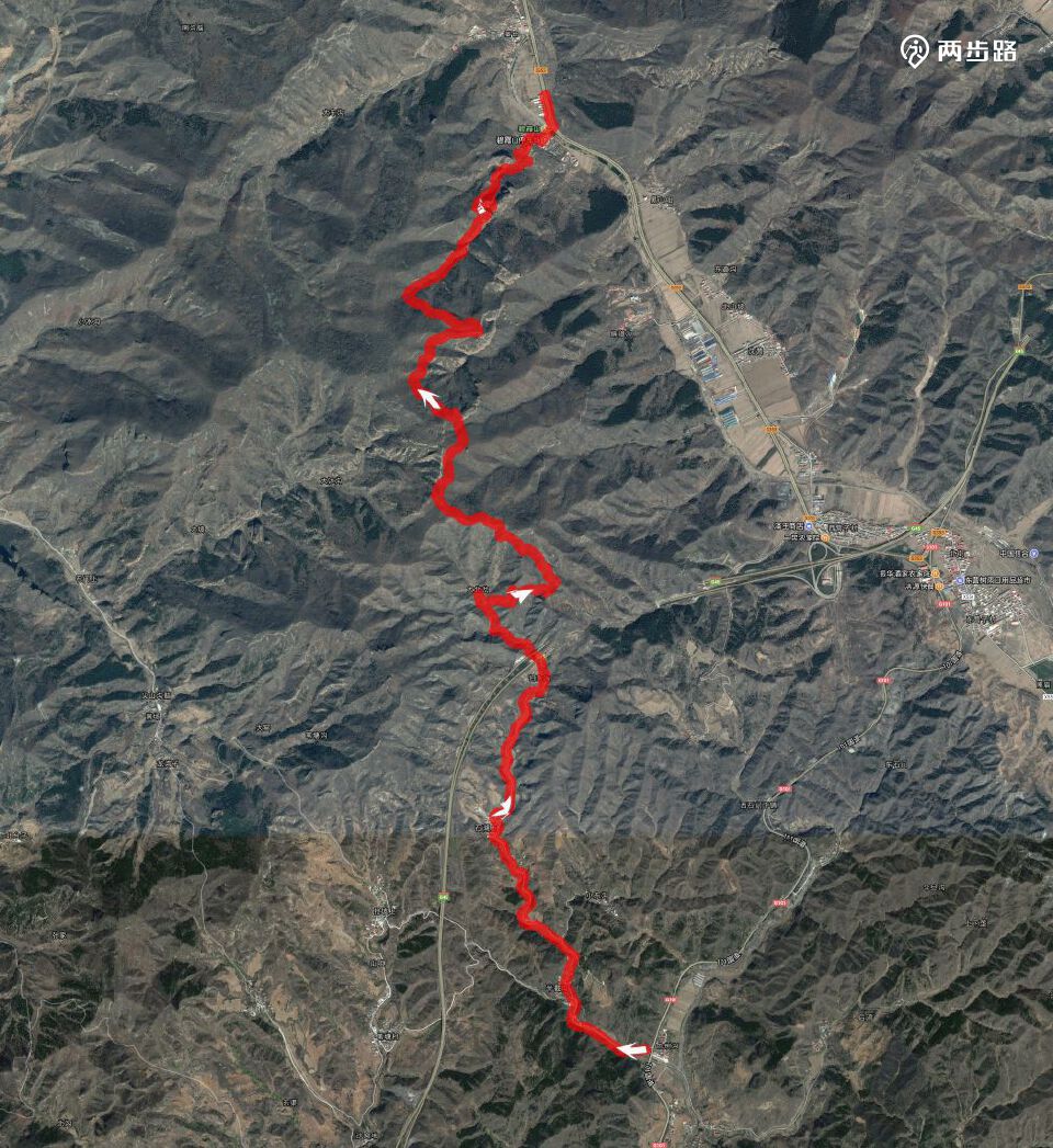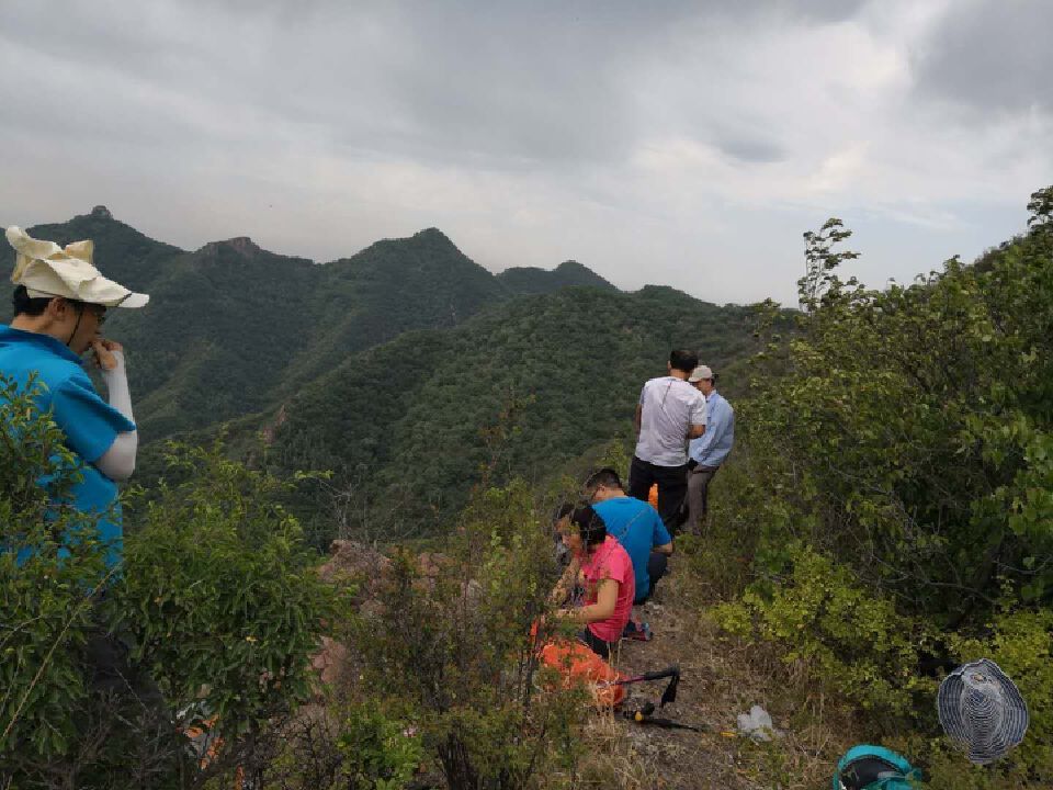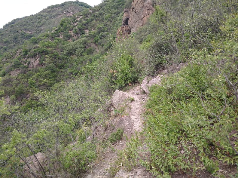 小雨只延续了几分钟。我规划的轨迹恰好穿过院子。我们继续前进,沿一条被水冲成沟的小路爬坡,然后与一条横切的村道汇合。看地图,它将翻过东边比村子只高出二三十米的侧脊,通往西营村。这条路中途还经过一道较陡较短的侧脊,沿着它有一条小路通往主脊,我带着大家走了100米,感到路况不好,原路返回横切村道,大明子不想损失高度,继续向上。其余5人一直走到下一条侧脊,才左转,沿一条等级没有明显下降的小路上升,约10分钟后,与大明子会合。小路转到主脊左侧横切,山脊侧面很陡,路的宽度在收缩。脚下就是大北岔村,一条模模糊糊的羊道沿村后陡峭的山坡迂回通到我们正在走的这条路。在一块大石头背后,路向右拐了一个大弯,又开始上升,一直升到山脊顶部。恰好是午餐时间。