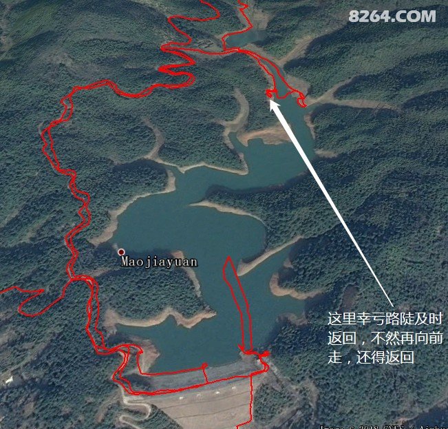 下到金盆水库尾,我们见到了一条小路,就直接下去了,沿着水库尾部走了一段之后,觉得无法在岸边走到大堤上去,就折回了。如图所示。