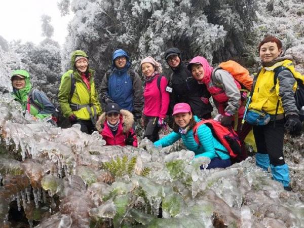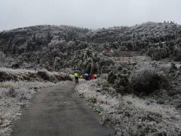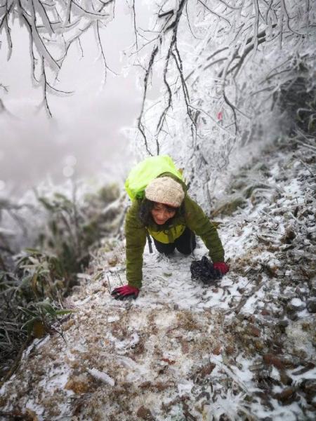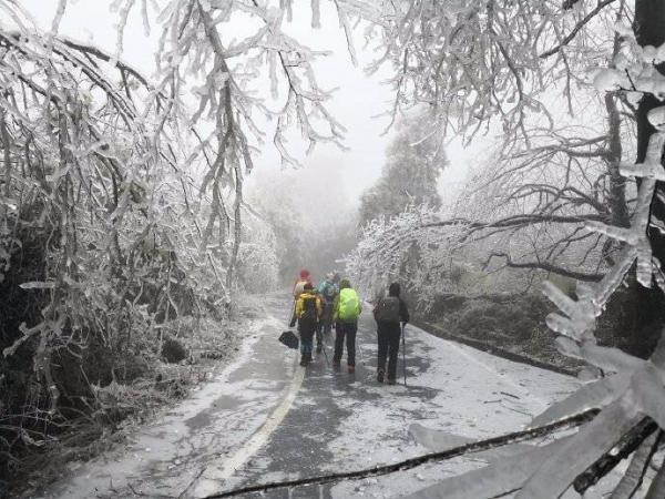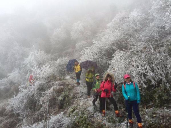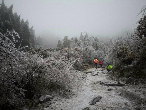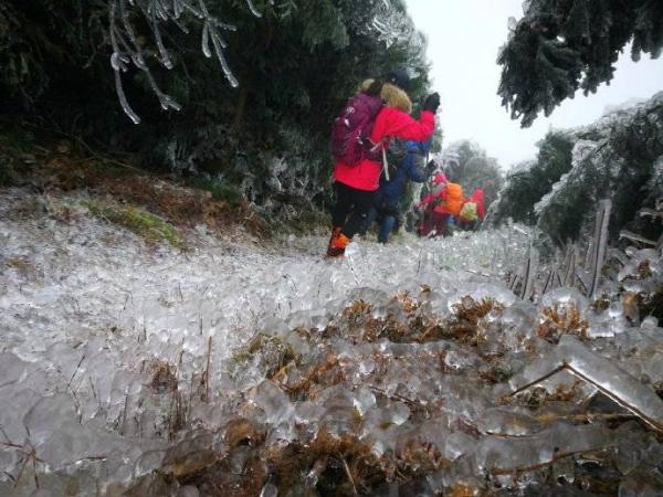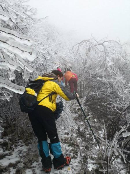 冰晶世界闯入眼帘。拇指粗的冰柱挂满枝头,整个世界都被包裹在了晶莹剔透的水晶里。从这里开始,世界突变,没有缓冲,没有过度,凄风冷雨开始裹挟而来,南北面的气候是如此的迥异。几天的冰冻,所有灌木枝条结上了厚厚的冰柱,不堪负重倒垂下来,使路面形成一个个冰帘,只能匍匐而行,此行唯一的“冯长青”高大魁梧的阿宽,开始痛苦不堪,同时不远处不时传来如雪崩般树枝倒塌的声响,在寂静的山谷中让我们惊心。随着没完没了的攀爬,大家初期的审美开始疲劳,饥饿的来临让我们只想快速的离开,下午1点半我们终于从危险的地段来到主路到达休息点广济寺。