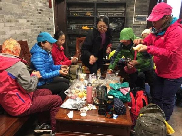 天气太冷没有游客,冷冷清清的寺庙里我们找到一间舒适的房间,出走社的传统午餐总是那么的丰盛,大家一起分享各自的食品。寺庙义工一个温和的阿姨为我们烧水搬凳,说话温柔有礼,让冰冷的天气瞬间温暖如春,特别喜欢这种人与人之间的温情。短暂的休息后时间紧迫,鱼姐决定不登祝融峰,从南天门下山。