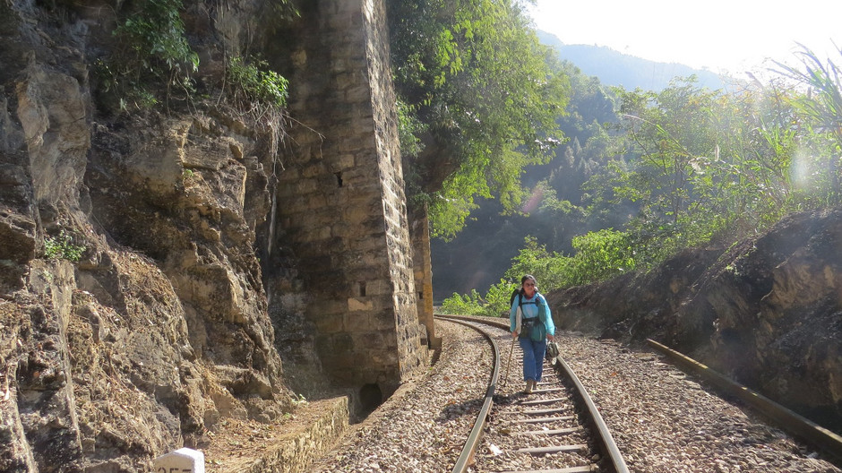 机耕道下到半山腰时,再次和滇越线相会,如同老友久别重逢一样,我们不再嫌弃走铁路了,只想在铁路上找个车站休息一下。