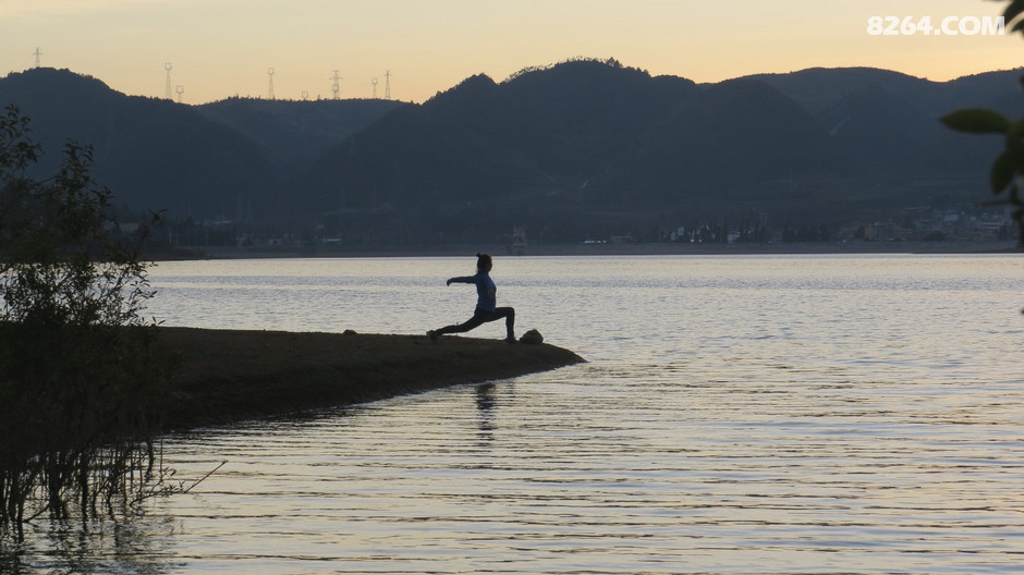 3人走在芷村镇的水汽蒸腾的水库边,有如仙境。