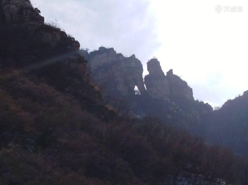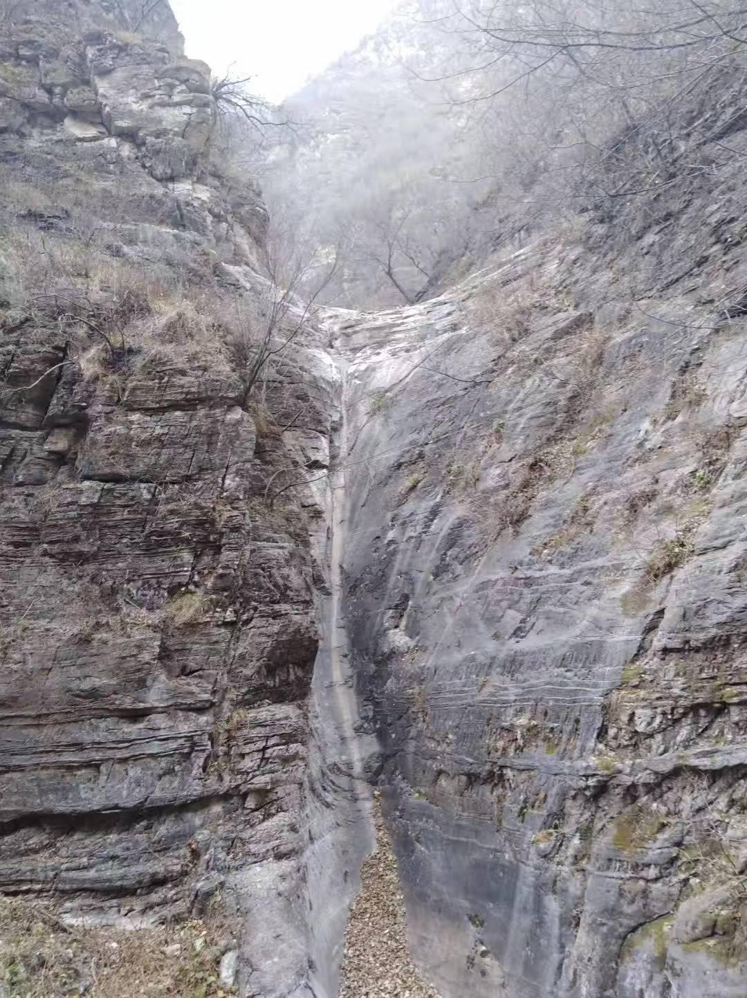在到达上双窑之前,峰回路转的位置,是一面又宽又高又薄的石壁,象四合院里常见的影壁,把上双窑村掩在后面,影壁南侧窄窄的一条缝就是路,沿着路绕到影壁后面稍高处,我们发现影壁上有一个大洞,高约3-4米,宽约2米,将影壁完全贯穿。起初以为是人工开凿而成,进去才知道是大自然的造物,是那不愿意绕弯子的水流日积月累地冲刷侵蚀,终于击穿了这道屏障,短路而出,一泻而下,形成影壁外侧的瀑布,当然,现在这些只能想象了,洞中已经滴水不存。