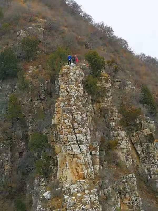 过了树林,又有一段梁鼻子上的下降,这是此行的第三次。下了梁鼻子,对面就是那个陡峭的巨大山峰,那顶上,我曾在地图上标注了C点。我们沿峭壁脚下的一条路向西倾斜下降,再横切,再上升。路越来越宽,绕过遮挡视线的石壁,两个形象生动的山峰进入视野,左边那座石峰毫无争议,地球人都看得出来,是一头小象,垂着长鼻子温顺站立,而它相邻的那座石峰,似乎是一个背着竹篓的胖乎乎的乡村少年,在与小象套近乎。【现为象鼻山】