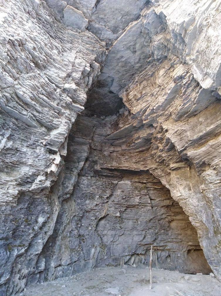 因为二锅头的缘故,我把这个洞叫作牛栏洞。由此继续向前,再绕一个弯,比路所在平面稍低的山壁上,还有一个洞,时间所限,已经无法深究。此处有路向西下沟,沟里有不少人工建筑,用色彩鲜艳的材料搭建,距离较远,不知其详情。路面很宽很平,有驴粪,这已经是驼道的标志。