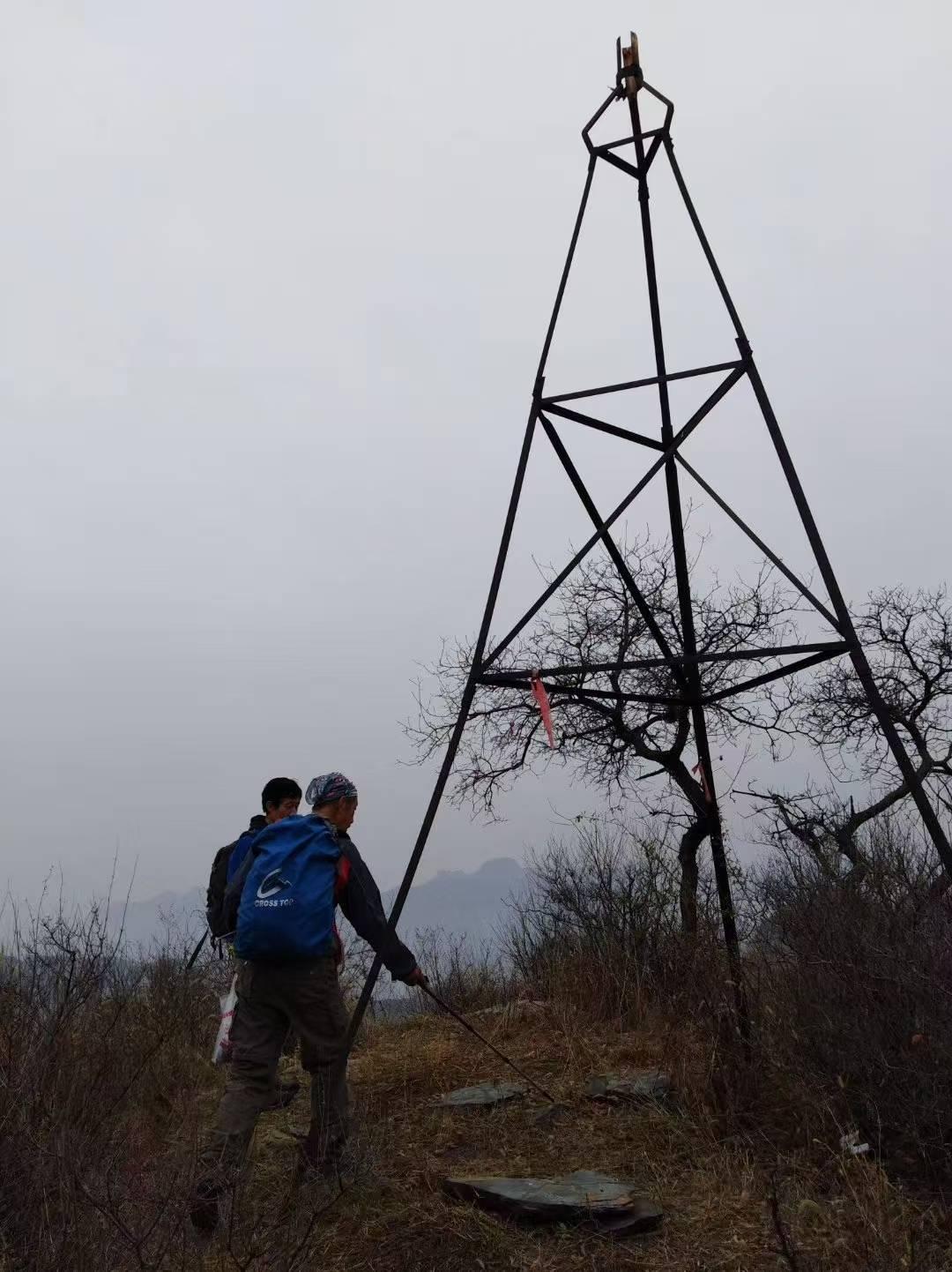 14:00 钻出最后的灌木林,眼前一亮,山头上赫然树着一个三角架(觇标),【猴山顶】
