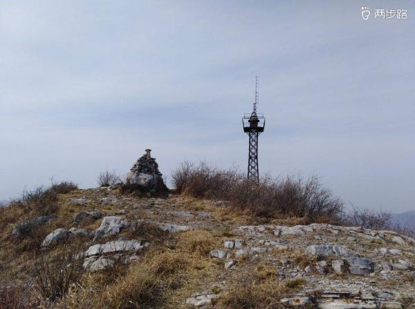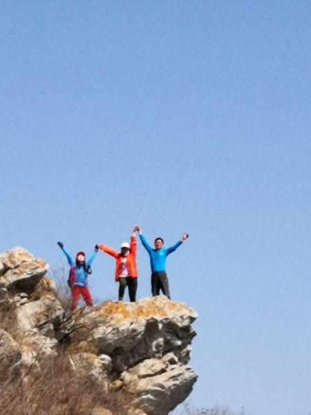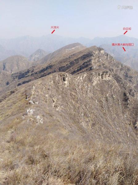 背后是十渡南侧山脊,能见度不佳,仅见三皇山和金字坨。