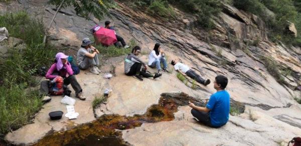 这只是第一个意外。第二个意外要由我负责,我在课题计划中只写了乘55路,忘记了提醒55路有两条支线,一条到上口,一条到碓臼峪。于是,除了乘对了车的棉芯和驱车前来的qiuchi、白兰,其他人都去了碓臼峪。结果是,集合时间晚了半小时,分出一个由大芳和小硕组成的小队由碓臼峪景区对穿与我们会合,大队的路线也修改了,不走车岭,由大梁西左转,前往大岭沟。