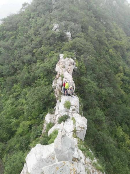 山顶西北走向下降,连走大约三个起伏跌宕,走到了去年11月积雪折返点,无雪就少了风险。之后有点难度的几处断崖5—10米,严格按照稳稳原则安全下来,带的绳子没用上,得力于有灌木、有抓手。