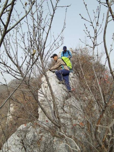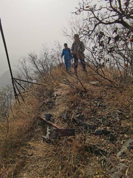 出现了路朝右侧即朝东南方向弯路,我有记忆了,朝南走了约50米没有发现左侧下山路口,于是折返朝北侧山峰硬爬,之后顺山脊朝东北方向走。有路很窄。北侧山坡很陡,南侧稍缓有多个山脊走向。