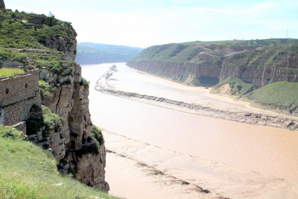 绝壁上弥佛栈洞。崖下黄河流淌,小径虽陡,张弛有序,雨醉云醒,柳暗花明。